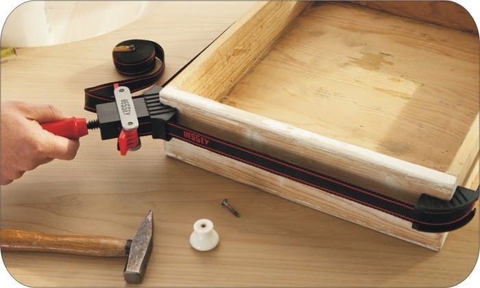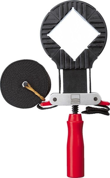 - profesjonalny ścisk (zacisk) taśmowy firmy Bessey do montażu elementów prostokątnych przy pomocy 4 narożników