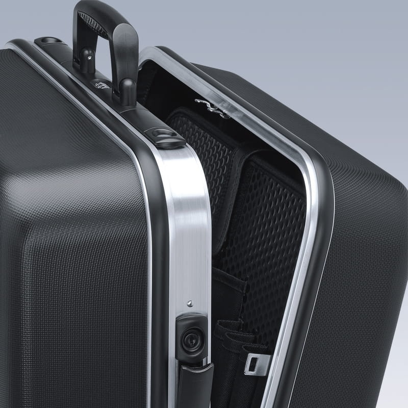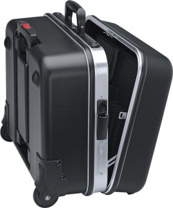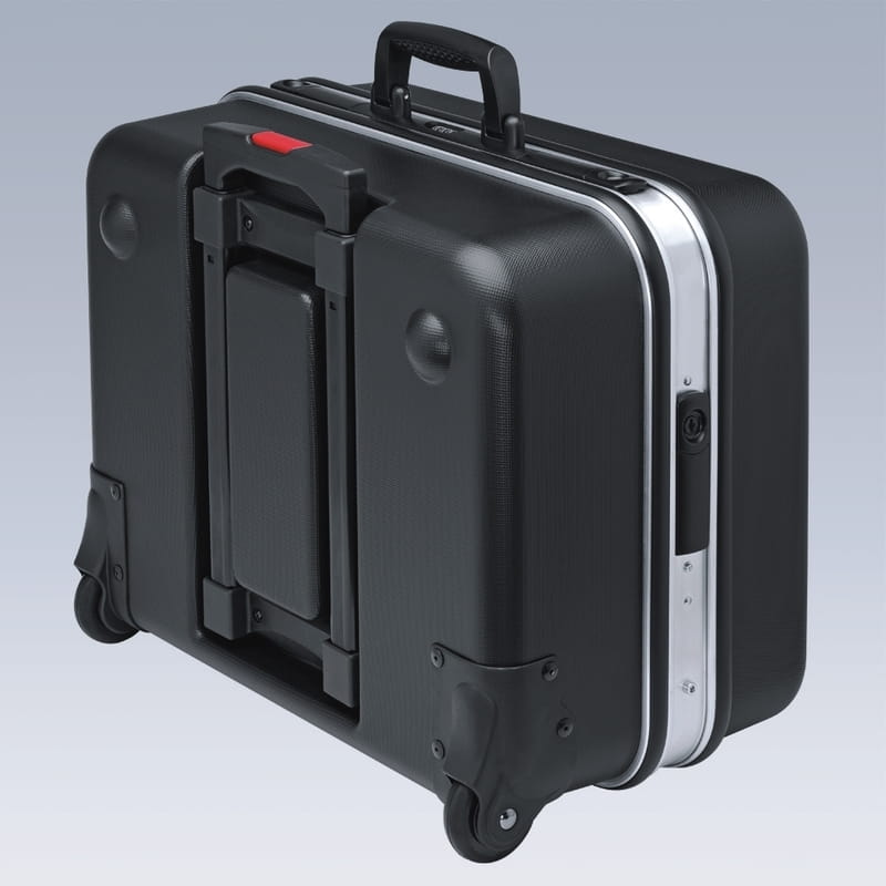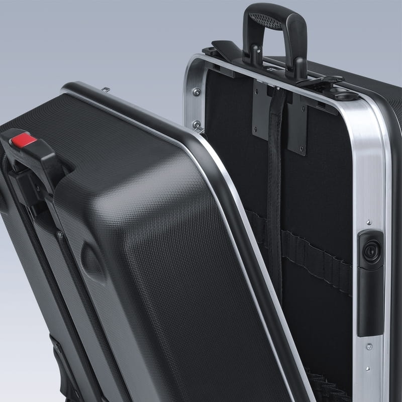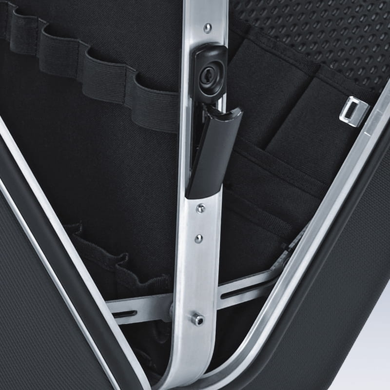Aluminiowa rama, z zamontowaną na stałe, stabilną ścianką środkową z obustronnymi uchwytami na narzędzia, elastyczne taśmy i 12 małych kieszeni pozwalają na dowolne porządkowanie narzędzi.