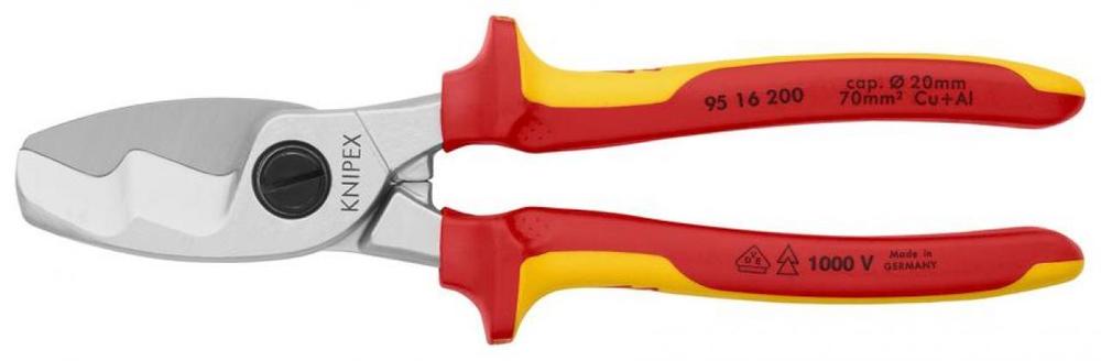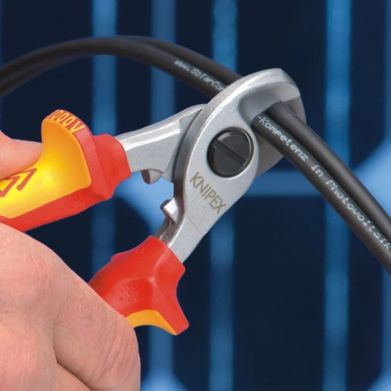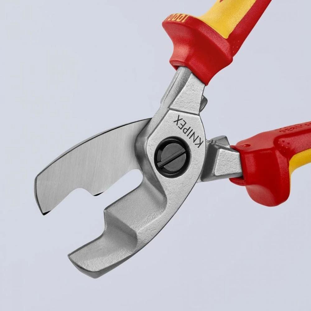 Profesjonalne nożyce firmy Knipex do cięcia kabli i przewodów miedzianych oraz aluminiowych (nieodpowiednie do cięcia drutu stalowego oraz drutu miedzianego ciągnionego na zimno!). Czyste i gładkie cięcie bez miażdżenia i deformacji. Precyzyjnie wykończone, hartowane ostrza. Kształt rękojeści zabezpiecza przed przyciśnięciem palców. Złącze skręcane z możliwością regulacji, samoblokujące. Podzielenie operacji cięcia na cięcie wstępne( izolacji za pomocą ostrza przedniego) i docięcie (przewodu za pomocą ostrza tylnego) umożliwia cięcie kabli kabli o średnicy Ø 20 mm jedną ręką. Wysokie przełożenie nożyc do cięcia kabli redukuje siłę potrzebną do obsługi oraz optymalna geometria ostrza. Wykonane ze stali narzędziowej, kutej, hartowanej olejowo. Rękojeści z wielokomponentowymi nasadkami, izolowane wg VDE. Nożyce do cięcia kabli są przydatne w pracach montażowych oraz serwisowych np. w budownictwie, elektryce i energetyce itp.