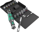 Profesjonalny 27-częściowy zestaw narzędzi Zyklop Pocket Set 3 firmy Wera. Zestaw narzędzi zawiera bity, klucze nasadowe, uniwersalny uchwyt, przedłużkę Zyklop z tuleją obrotową oraz kompaktową grzechotką Zyklop z wbudowanym magazynkiem na bity. Magnetyczny uchwyt bezpośrednio do bitów ¼" i kluczy nasadowych 3/8". Bardzo szybka wymiana narzędzi dzięki uchwytowi bez blokady. Główka grzechotki z możliwością ustawienia w pozycjach 0°, 15° i 90° w prawo i lewo za pomocą przełącznika suwakowego znajdującego się po obu stronach. Dzięki temu zapewniona jest bezpieczna praca bez ryzyka "wyślizgiwania się" główki grzechotki. Drobnozębny mechanizm zapadkowy z 72 zębami umożliwia uzyskanie niewielkiego kąta powrotu zapadki wynoszącego zaledwie 5° pozwala na pracę w wąskich przestrzeniach montażowych, zapewniając wystarczającą przestrzeń dla ruchu ręki. Szybkie i łatwe przełączanie kierunku pracy prawo/lewo w dowolnym położeniu za pomocą radełkowanego pokrętła. W rękojeści kompaktowej grzechotki Zyklop znajduje się zabezpieczony przed zgubieniem, swobodnie obracający się magazynek na 12 bitów. Wytrzymały mechanizm zapadkowy zapewnia odpowiedni moment obrotowy. Doskonałe połączenie grzechotki Zyklop z 12-częściowym zestawem narzędzi wkrętakowych. Uniwersalny uchwyt do bitów 1/4" o długości 75 mm może być używany jako przedłużka. Zestaw narzędzia zawiera klucze nasadowe w najczęściej stosowanych rozmiarach. Kompaktowa grzechotka Zyklop z magazynkiem na bity zmieści się w kieszeni spodni. Zestaw w tekstylnym etui kompatybilnym z elementami systemu Wera 2go.