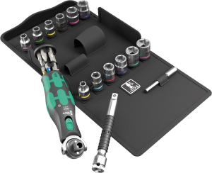 Profesjonalny 27-częściowy zestaw Zyklop Pocket Set 3 firmy Wera. Zestaw zawiera bity, klucze nasadowe, uniwersalny uchwyt, przedłużkę Zyklop z tuleją obrotową oraz kompaktową grzechotką Zyklop z wbudowanym magazynkiem na bity. Magnetyczny uchwyt bezpośredni do bitów ¼" i kluczy nasadowych 3/8". Bardzo szybka wymiana narzędzi dzięki uchwytowi bez blokady. Główka grzechotki z możliwością ustawienia w pozycjach 0°, 15° i 90° w prawo i lewo za pomocą przełącznika suwakowego znajdującego się po obu stronach. Dzięki temu zapewniona jest bezpieczna praca bez ryzyka "wyślizgiwania się" główki grzechotki. Drobnozębny mechanizm zapadkowy z 72 zębami umożliwia uzyskanie niewielkiego kąta powrotu zapadki wynoszącego zaledwie 5° pozwala na pracę w wąskich przestrzeniach montażowych, zapewniając wystarczającą przestrzeń dla ruchu ręki. Szybkie i łatwe przełączanie kierunku pracy prawo/lewo w dowolnym położeniu za pomocą radełkowanego pokrętła. W rękojeści kompaktowej grzechotki Zyklop znajduje się zabezpieczony przed zgubieniem, swobodnie obracający się magazynek na 12 bitów. Wytrzymały mechanizm zapadkowy zapewnia odpowiedni moment obrotowy. Doskonałe połączenie grzechotki Zyklop z 12-częściowym zestawem narzędzi wkrętakowych. Uniwersalny uchwyt do bitów 1/4" o długości 75 mm może być używany jako przedłużka. Zestaw zawiera klucze nasadowe w najczęściej stosowanych rozmiarach. Kompaktowa grzechotka Zyklop z magazynkiem na bity zmieści się w kieszeni spodni. Zestaw w tekstylnym etui kompatybilnym z elementami systemu Wera 2go.