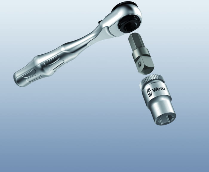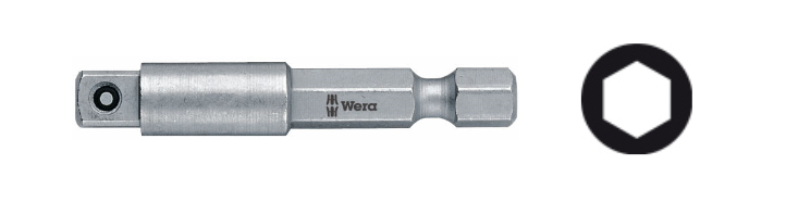 Profesjonalny adaptor (adapter) firmy Wera do kluczy nasadowych maszynowych (nasadek) z gniazdem (zabierakiem) czworokątnym. Chwytem sześciokątnym 1/4" (E 6.3) do mocowania bezpośrednio we wkrętarce, do kluczy nasadowych z zabierakiem 1/4" lub 3/8". Adapter z trzpieniem zabezpieczającym klucz nasadowy przed zsunięciem się (zdjęcie klucza wymaga wciśnięcia trzpienia przy użyciu narzędzia) Umożliwia współpracę kluczy nasadowych np. z wkrętarką akumulatorową z gniazdem sześciokątnym.