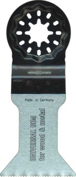 Uniwersalne, faliste uzębienie pozwala na cięcie takich materiałów jak blacha o grubości do 2 mm, metale nieżelazne, aluminium, drewno, płyty gipsowo-kartonowe, czy też gips. Szeroki brzeszczot umożliwia cięcie większej ilości materiału i lepsze odprowadzenie wiórów. Wykonany z bimetalu brzeszczot jest trwały i odporny na temperaturę, która powstaje podczas pracy. Mocowanie STARLOCK pozwala na przeniesienie 100% siły z elektronarzędzia na brzeszczot. Tego rodzaju mocowanie zapobiega powstawaniu luzów jak w przypadku połączeniu adapterami. Montaż brzeszczotu STARLOCK jest prosty, szybki i bezpieczny, bez dotykania ostrza i użycia narzędzi.