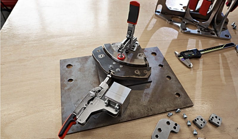 - profesjonalny docisk (zacisk) kolankowy pionowy firmy Bessey do szybkiego i pewnego montażu obrabianych elementów o różnych wysokościach