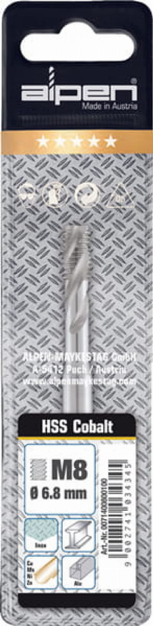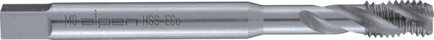 Profesjonalny gwintownik maszynowy spiralny do metalu firmy Alpen do nacinania gwintów metrycznych wg ISO. Wykonany z wysokogatunkowej stali HSS-Co (cobalt) z 5% dodatkiem kobaltu zwiększającym odporność na temperaturę. Przydatne do prac warsztatowych oraz produkcyjnych do gwintowania otworów w elementach ze stali automatowej (do 850 N/mm²), stali stopowej (do 1300 N/mm²) i niestopowej (do 1100 N/mm²), stali nierdzewnej i kwasoodpornej, żeliwa szarego i ciągłego, stopów mosiądzu, miedzi, stopów aluminium dających krótkie wióry, tworzyw sztucznych, kształt C, do gwintów w otworach nieprzelotowych. Dzięki właściwemu kątowi nacięcia 35º pozwala na bardzo precyzyjne nacinanie gwintów. Głębokość gwintowania do 2xd, precyzyjnie wykonane i ostrzone.