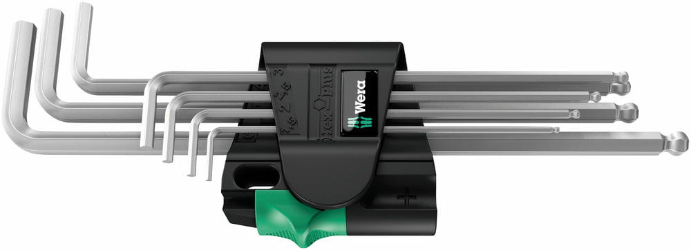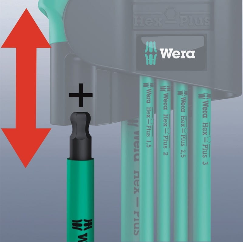 Zestaw siemiu profesjonalnych długich kluczy trzpieniowych sześciokątnych z magnetyzerem (tzw. imbusowych, ampulowych) firmy Wera do śrub i wkrętów z gniazdem sześciokątnym. Chromowane wyróżniające się wysoką odpornością na korozję. W rozmiarach od 1,5 do 6 mm z systemem Hex-Plus. Najczęściej klucze trzpieniowe często powodują odkształcanie gniazda śruby w skutek czego śruby nie można już odkręcić a klucz wyślizguje się z gniazda. Klucze imbusowe z profilem Hex - Plus posiadają większe powierzchnie styku w gnieździe śruby, co ogranicza efekt działania karbu i ryzyko odkształcenia gniazda. Dodatkowo profil Hex- Plus umożliwia przeniesienie momentu obrotowego większego o 20%. Klucz imbusowy z profilem Hex - Plus może być stosowany do standardowych wkrętów z gniazdem sześciokątnym. Kulka umieszczona na końcówce klucza pozwala na odchylenie osi narzędzia względem osi wkrętu umożliwiając odkręcenie i dokręcenie pod kątem. Wszystkie klucze trzpieniowe posiadają oznaczenie rozmiarów umożliwiających szybki dostęp do właściwego narzędzia. Klucze wykonane ze stali wysokostopowej. Poręczny uchwyt z magnetyzerem zapobiega wypadaniu kluczy. Praktyczny suwak gwarantuje łatwe otwieranie rozkładanego uchwytu, pozwala na szybkie i łatwe wyjęcie narzędzia. Klucze imbusowe stosowane np. w urządzeniach, maszynach, meblach, rowerach itp.