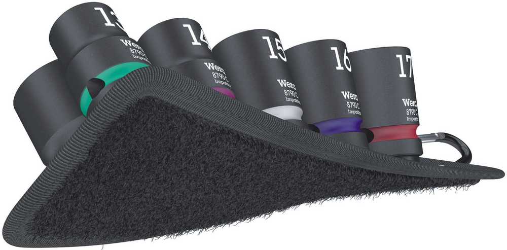 Podręczna zawieszka tekstylna z 9 kluczami nasadowymi Wera Impaktor. Wykonany z wytrzymałego materiału ze specjalnym mechanizmem obrotowym do łatwego mocowania i wyjmowania nasadek. Zawieszka wyposażona jest w karabińczyk do zamocowania na szlufce lub pasku torby. Nasadki Impaktor przeznaczone są do stosowania z wkrętarkami udarowymi elektrycznymi lub pneumatycznymi. Klucze nasadowe impaktor są bardzo wytrzymałe dzięki czemu pozwalają na pracę nawet w trudnych warunkach. Klucze nasadowe z zestawu Belt C Impaktor 1 przeznaczone są do montażu śrub i nakrętek z łbem sześciokątnym. Tego rodzaju profil pozwala na przenoszenie większych sił niż w przypadku tradycyjnego dwunastokrawędziowego profilu. Łatwe odnalezienie odpowiedniej nasadki zapewnia oznaczenie kolorystyczne. Zawieszka Belt to praktyczny zestaw narzędzi, a jednocześnie modny zestaw dla kolekcjonera.