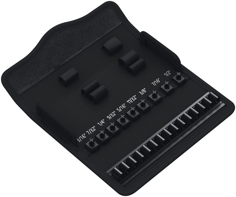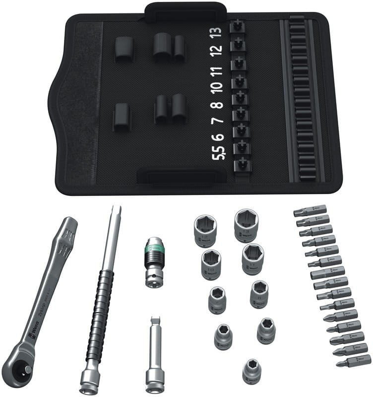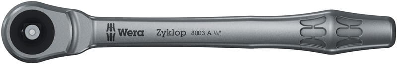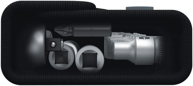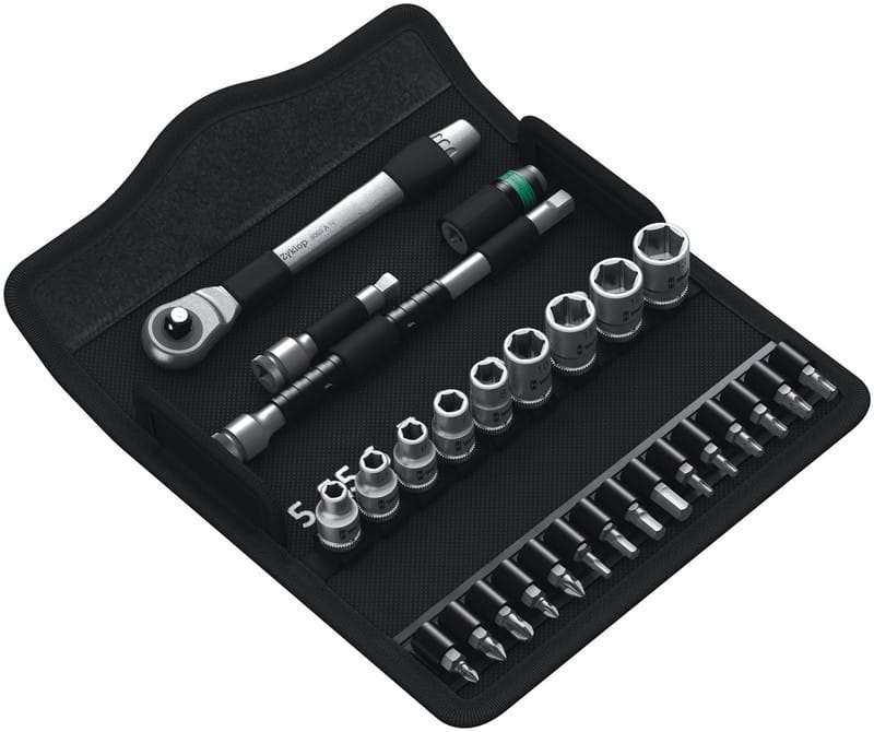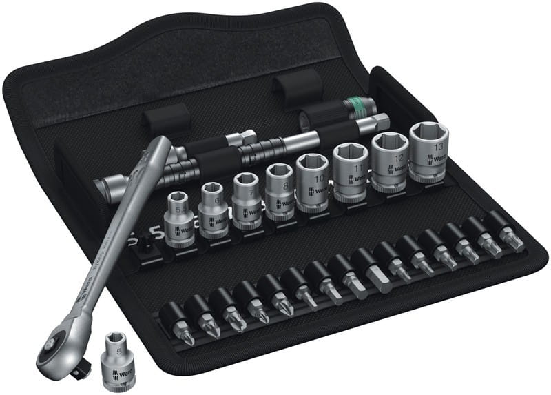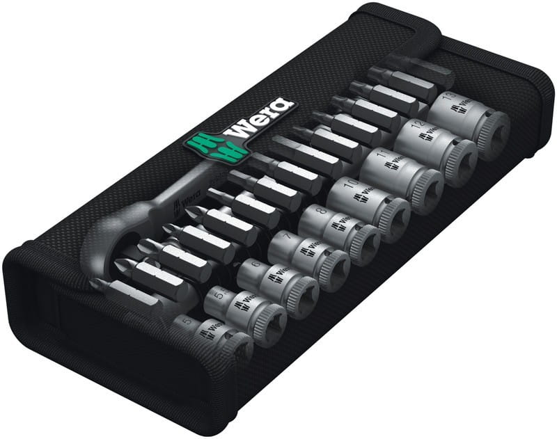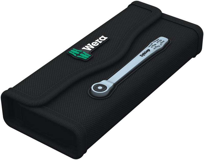 Zestaw kluczy nasadowych (nasadek) 1/4" z pokrętłem zapadkowym (grzechotką) "Zyklop Metal" firmy Wera. Narzędzia wykonane wykonane ze stali chromowo-wanadowej. Zestaw w bardzo wytrzymałym i twardym tekstylnym etui zapinanym na rzep. Narzędzia niezwyczajnie rozmieszczone na małej powierzchni. Tkanina tekstylna na stronie zewnętrznej chroni powierzchnie narażone na zarysowania. Małe rozmiary i niewielka waga zapewniają dużą mobilność. Możliwość ustawienia w pozycji pionowej pozwalające na przejrzyste przechowywania na półce warsztatowej. Zestaw przydatny do wszelkiego rodzaju prac montażowych i serwisowych w warsztatach oraz w przemyśle