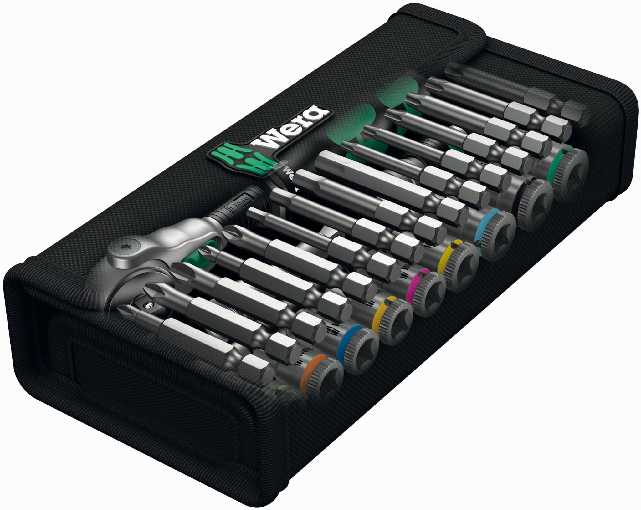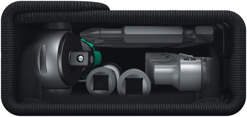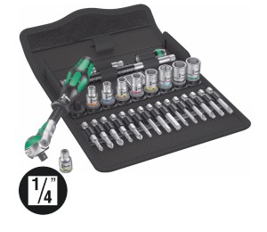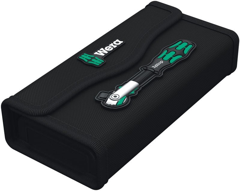 Zestaw kluczy nasadowych 1/4" z pokretłem zapadkowym (grzechotką) "Zyklop Speed" firmy Wera. Narzędzia wykonane wykonane ze stali chromowo-wanadowej. Zestaw w bardzo wytrzymałym i twardym tekstylnym etui zapinanym na rzep. Narzędzia niezwyczajnie rozmieszczone na małej powierzchni. Tkanina tekstylna na stronie zewnętrznej chroni powierzchnie narażone na zarysowania. Małe rozmiary i niewielka waga zapewniają dużą mobilność. Możliwość ustawienia w pozycji pionowej pozwalające na przejrzyste przechowywania na półce warsztatowej. Narzędzia przydatne do wszelkiego rodzaju prac montażowych i serwisowych w warsztatach oraz w przemyśle.