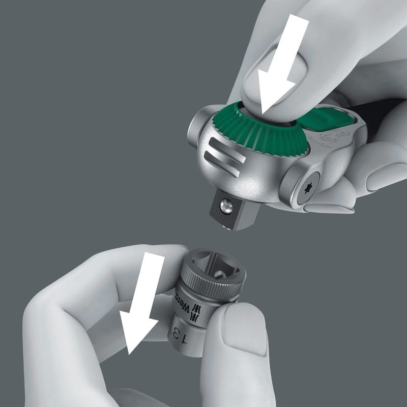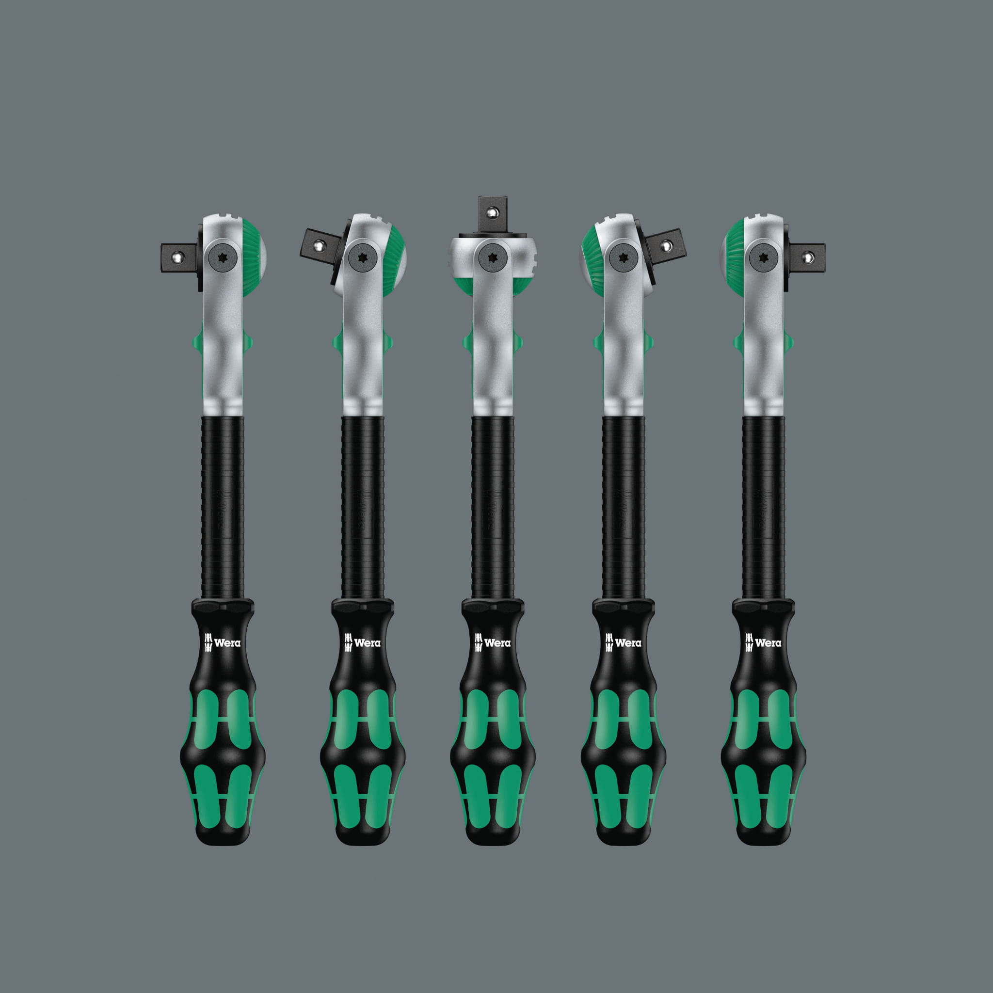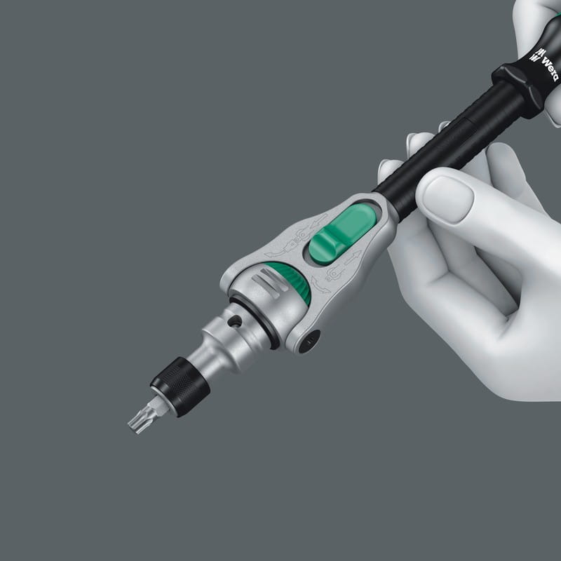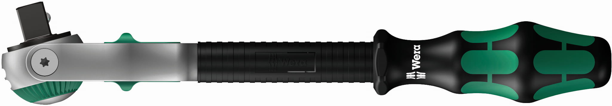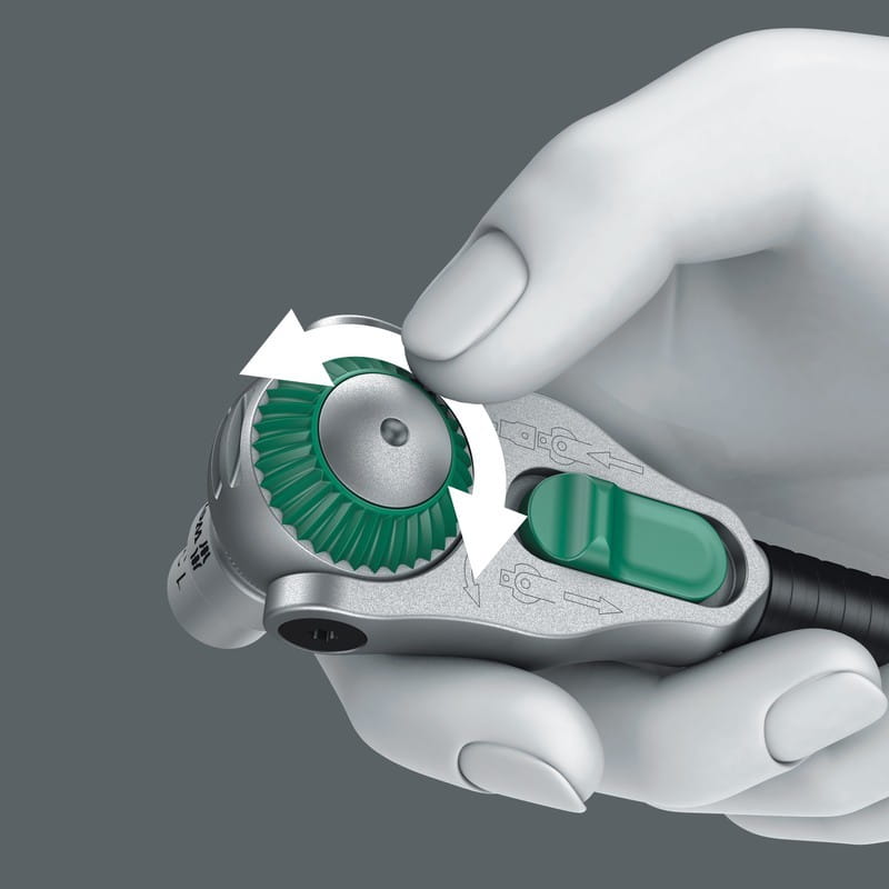 Grzechotka "Zyklop Speed" profesjonalne pokrętło zapadkowe (grzechotka) firmy Wera do kluczy nasadowych z zabierakiem 3/8" i z zatrzaskiem kulkowym. Mechanizm zapadkowy z 72 zębami zapewniający niewielki kąt powrotu zapadki wynoszący zaledwie 5°. Główkę grzechotki można bez problemu obracać i blokować w dowolnym położeniu za pomocą przełącznika suwakowego znajdującego się po obu stronach. Gwarantuje to bezproblemową pracę nawet w bardzo wąskich lub trudno dostępnych miejscach, zapewniając wystarczającą przestrzeń dla ruchu ręki. Blokowanie położenia główki w pozycji 0° oraz 15° i 90° w prawo i lewo gwarantuje bezpieczną pracę bez ryzyka "wyślizgiwania się" główki grzechotki. Przy zastosowaniu adapteru i bitu w pozycji 0º, z powodzeniem zastąpi zwykły wkrętak. Tuleja z tworzywa umożliwia bardzo szybkie obracanie grzechotką w celu wstępnego dokręcenia lub poluzowania mocowanego elementu. Ergonomiczna rękojeść Kraftform znakomicie dopasowuje się do kształtu dłoni, chroniąc ją przed powstawaniem pęcherzy i odcisków. Twarde elementy materiału rękojeści pozwalają na szybkie pokręcanie bez ryzyka "przyklejania się" dłoni do rękojeści. Miękkie, antypoślizgowe strefy umożliwiają bezstratne przenoszenie dużych sił. Grzechotka "Zyklop Speed" to najszybsza grzechotka na rynku o wielu unikalnych funkcjach. Przydatna do prac serwisowych i warsztatowych oraz zastosowań przemysłowych.najszybsza grzechotka na rynku o wielu unikalnych funkcjach.