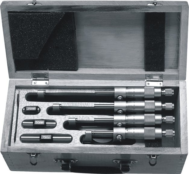 Zestaw SCALA 533.560 zawiera 4 mikrometry, umożliwiające pomiary w szerokim zakresie, i dostarczany jest w solidnej drewnianej skrzyni, która chroni narzędzia przed uszkodzeniem, ułatwia ich organizację oraz idealnie nadaje się do bezpiecznego przechowywania i transportu.