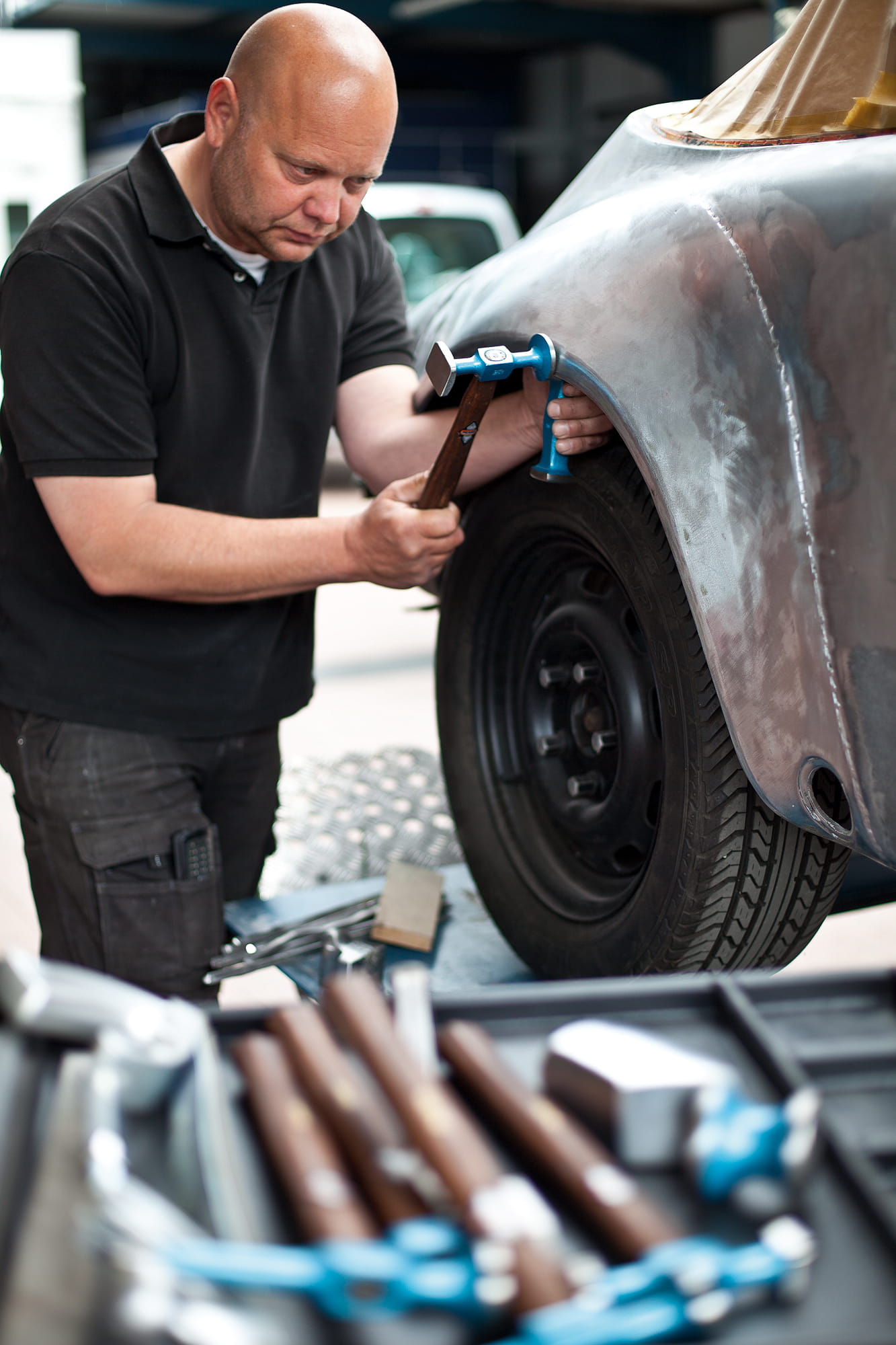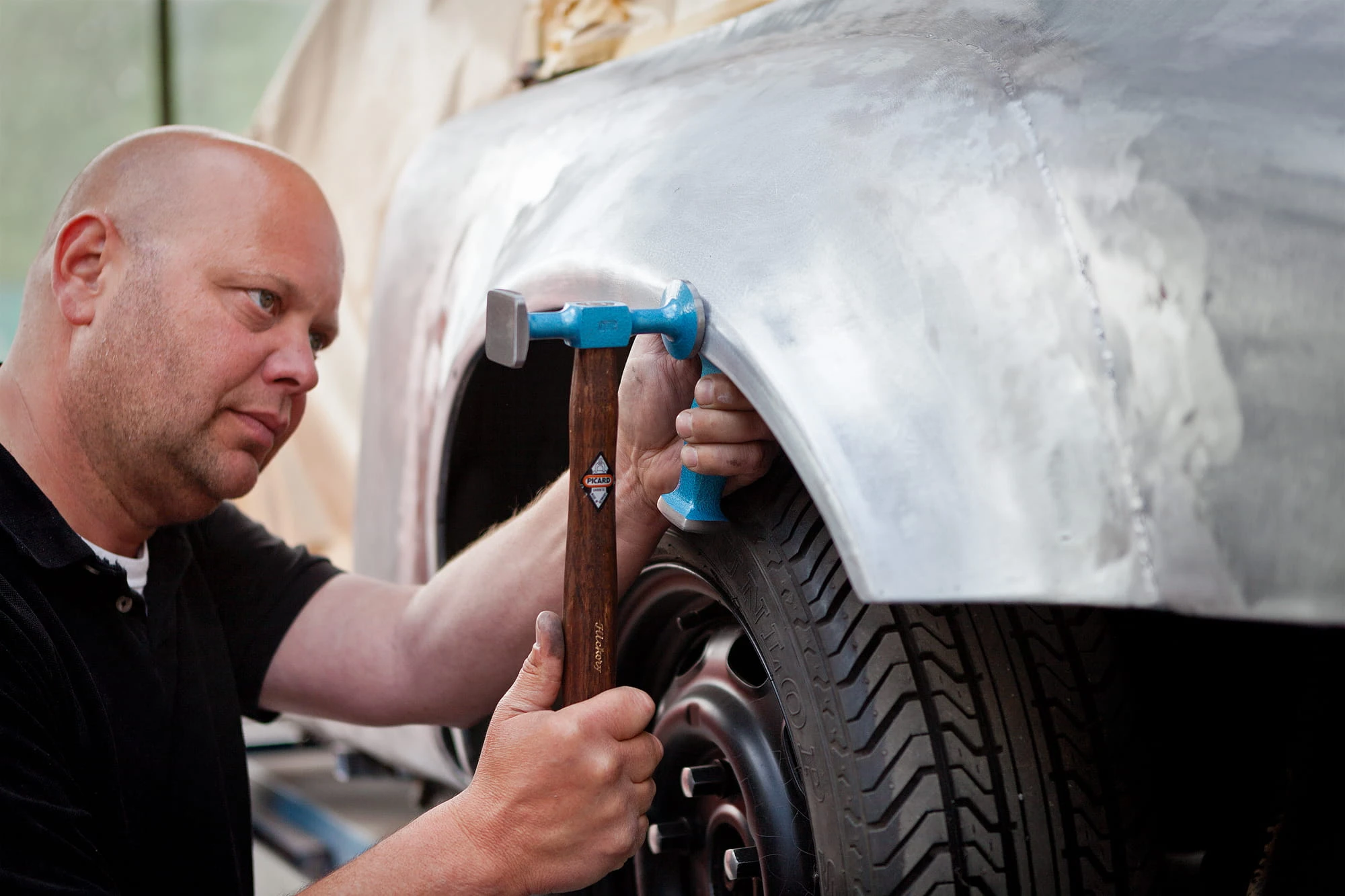 Profesjonalny młotek blacharski, wykonany ze specjalnego stopu PICARD - stali, starannie hartowanej i odpuszczanej. przeznaczony do wygładzania. Obuch z dwoma płaskimi polerowanymi końcówkami o profilu kwadratowym i okrągłym, głowa młotka pokryta niebieską emalią. Młotek blacharki został wyposażony w trzonek osadzony w obuchu i zabezpieczony klinem co zapobiega wypadaniu podczas pracy. Trzonek wykonany z drewna hikorowego, specjalny kształt i podwójnie zakrzywiona rękojeść minimalizuje ześlizgiwanie się dłoni. Młotek przydatny do formowania i wykańczania blach i innych metalowych elementów.
