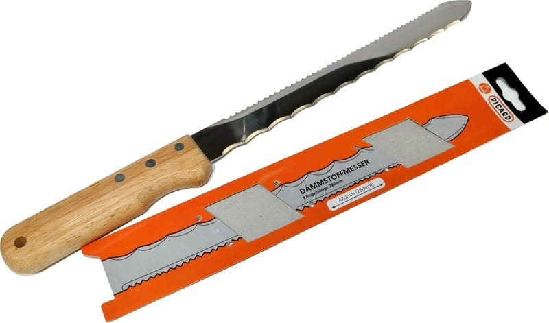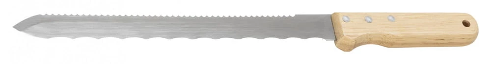 Profesjonalny nóż firmy Picard do cięcia waty izolacyjnej. Obustronny z piłą i ząbkowaną krawędzią ze stali nierdzewnej, polerowany. Drewniana rękojeść z jednostronną ochroną palców. Przydatny podczas montażu i docinania izolacji z waty mineralnej.