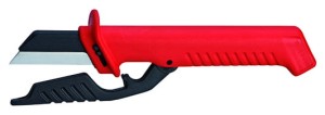 Profesjonalny nóż do obróbki kabli firmy Knipex. Ostrze wymienne, specjalnie ostrzone. Ze składaną osłoną ostrza, zamocowaną w rękojeści. Grzbiet ostrza izolowany tworzywem sztucznym zapewnia ochronę przed zwarciem. Rękojeść z kołnierzem zabezpieczającym przed ześlizgiwaniem się ręki. Ostrze wykonane ze stali chirurgicznej, nierdzewnej, hartowanej na powietrzu. Izolacja VDE do 1000V zgodnie z PN-EN60900. Nóż przydatny do wszelkiego rodzaju przemysłowych i warsztatowych prac montażowych oraz serwisowych.