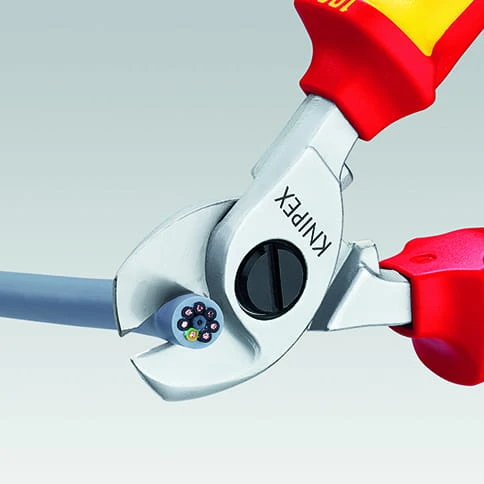 Profesjonalne nożyce do cięcia kabli firmy Knipex ze zintegrowanym zaczepem izolowanym do zamocowania zabezpieczenia narzędzi przed upadkiem z wysokości w trakcie pracy. Przeznaczony do cięcia kabli i przewodów miedzianych oraz aluminiowych, nieodpowiednie do cięcia drutu stalowego oraz drutu miedzianego ciągnionego na zimno. Czyste i gładkie cięcie bez miażdżenia i deformacji. Łatwe cięcie nawet jedną ręką. Precyzyjnie wykończone, hartowane ostrza. Kształt rękojeści zabezpiecza przed przyciśnięciem palców. Złącze skręcane z możliwością regulacji, samoblokujące. Nożyce do cięcia kabli wykonane zostały ze stali narzędziowej, kutej, hartowanej olejowo. Rękojeści z wielokomponentowymi nasadkami, izolowane wg VDE. Nożyce do cięcia kabli są przydatne w pracach montażowych oraz serwisowych np. w budownictwie, elektryce i energetyce itp.