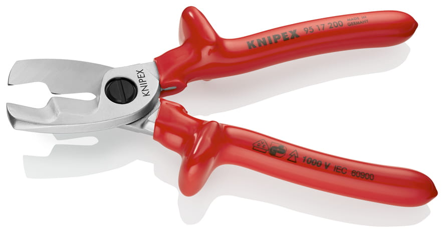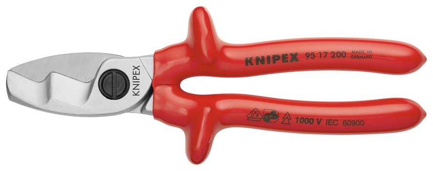 Profesjonalne nożyce firmy Knipex do cięcia kabli i przewodów miedzianych oraz aluminiowych.Nieodpowiednie do cięcia drutu stalowego i przewodów miedzianych ciągnionych na twardo. Cięcie dwuetapowe pozwala na łatwe przecinanie grubych kabli nawet jedna ręką. Regulowane złącze śrubowe, samozabezpieczająca śruba. Osłona przed przyciśnięciem zapobiega przyszczypnięciu palców. Czyste i gładkie cięcie bez zgniatania i deformacji. Precyzyjnie szlifowane, hartowane ostrza. Nożyce wykonane ze stali narzędziowej, wysokiej jakości, kutej, hartowanej olejowo. Rękojeści z grubego PCW, izolowane VDE do 1000V zgodnie z PN-EN60900. Przydatne w pracach montażowych oraz serwisowych np. w budownictwie, elektryce i energetyce itp.