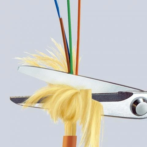 Nożyczki firmy Knipex, wyłącznie do cięcia włókien kewlarowych w kablach światłowodowych, nieodpowiednie do cięcia innych materiałów ( cięcie innych materiałów znacząco skraca żywotność). Nożyczki do włókien kewlarowych mają precyzyjne ostrza z drobnymi ząbkami zapobiegają wyślizgiwaniu się włókien i zapewniają czyste cięcie. Precyzyjne nitowane złącze nożyczek do włókien kewlarowych zapewnia płynną i lekką pracę, umożliwiając cięcie nawet cienkich włókien kewlarowych. Chromowane, szlifowane. Korpus nożyczek do włókien kewlarowych wykonany ze stali elektrycznej chromowo-wanadowej, hartowanej olejowo. Rękojeści z tworzywa sztucznego, odporne na uderzenia. Nożyczki kewlarowe są przydatne do zastosowań przemysłowych.