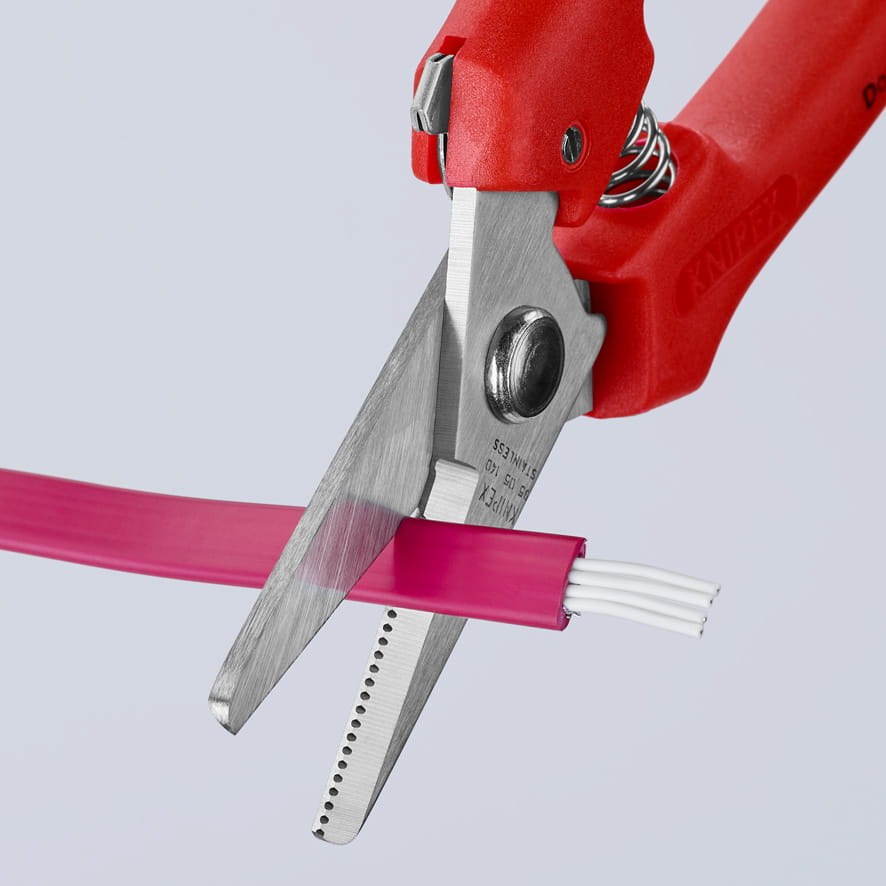 Profesjonalne nożyczki uniwersalne Knipex do cięcia papieru, kartonu, gumy, korka, skóry, tworzywa sztucznego, cienkich wykładzin podłogowych, a także miękkiej blachy do 0,4 mm. Nie nadaje się do drutu stalowego lub blach żelaznych. Ostrza z ząbkami zapobiegają ześlizgnięciu się przecinanego materiału. Ze sprężyną otwierającą oraz blokadą otwarcia. Złącze skręcane z możliwością regulacji. Kształt rękojeści zabezpiecza przed przyciśnięciem palców. Korpus nożyc wykonany ze stali chirurgicznej, nierdzewnej, hartowanej olejowo. Rękojeści z tworzywa sztucznego, odporne na uderzenia. Nożyczki przydatne do zastosowań przemysłowych, rzemieślniczych, a także domowych.