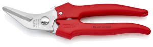 Profesjonalne nożyczki uniwersalne Knipex do cięcia papieru, kartonu, gumy, korka, skóry, tworzywa sztucznego, cienkich wykładzin podłogowych, a także miękkiej blachy do 0,4 mm. Nie nadaje się do drutu stalowego lub blach żelaznych. Wygięte ostrza umożliwiają łatwiejsze cięcie dłuższych odcinków. Ostrza z ząbkami zapobiegają ześlizgnięciu się przecinanego materiału. Ze sprężyną otwierającą oraz blokadą otwarcia. Złącze skręcane z możliwością regulacji. Kształt rękojeści zabezpiecza przed przyciśnięciem palców. Korpus nożyc wykonany ze stali chirurgicznej, nierdzewnej, hartowanej olejowo. Rękojeści z tworzywa sztucznego, odporne na uderzenia. Nożyczki przydatne do zastosowań przemysłowych, rzemieślniczych, a także domowych.