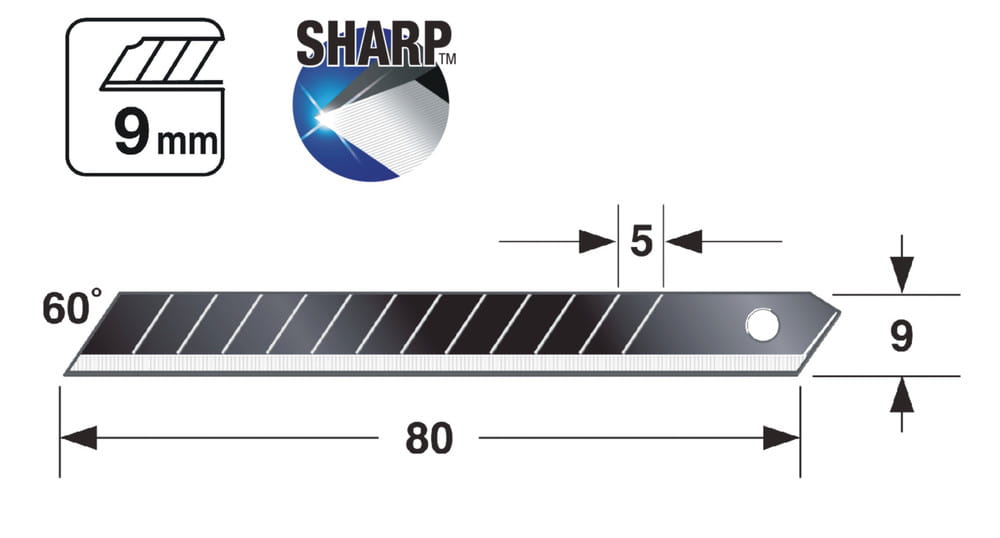 Wysokiej klasy profesjonalne ostrze segmentowe 9 mm łamane firmy Tajima do różnych modeli noży. Trwałość i ostrość ostrza jest niezwykła ze względu na jakość stali, z której jest wykonane, a technologia hartowania i ostrzenia jest najnowocześniejsza. Stal ta produkowana jest w Japonii, a tradycja produkcji ostrzy łamanych w Tajimie sięga 100 lat. Krawędź tnąca podobna do ostrza żyletki. Ostrze segmentowe 9 mm doskonale nadaje się zwłaszcza do precyzyjnego i dokładnego cięcie i docinania cienkich materiałów. W bezpiecznym magazynku z tworzywa. Przeznaczone do ogólnego zastosowania, do cięcia m.in. papieru, kartonu, tworzywa, materiału itp.