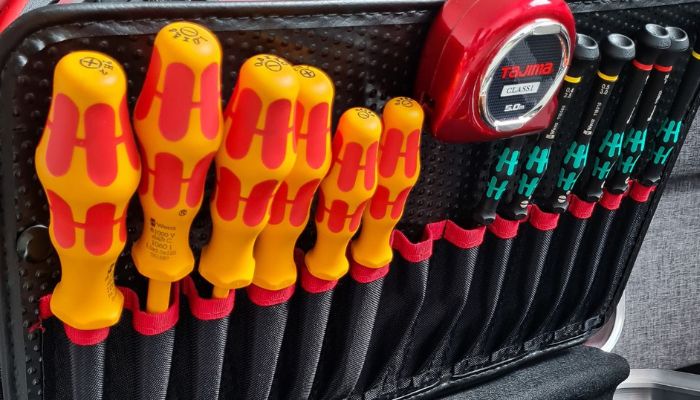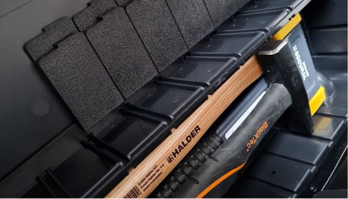 Walizkę narzędziową PARARED z zewnątrz wykonano z niezwykle odpornego na uderzenia, czerwonego tworzywa X-ABS, natomiast jej środek zabezpieczono materiałem Con-Pearl, zapewniającym wodoodporną ochronę przed ewentualnym wypłynięciem cieczy. Skoro jesteśmy przy wnętrzu, warto zaznaczyć, że wyposażono je aż w 35 kieszeni o różnej szerokości, tak by każde narzędzie znalazło swoje miejsce. Kieszenie znajdziemy na dwóch tablicach narzędziowych, w tym jednej dwustronnej, dzięki czemu łatwiej zachowasz we wnętrzu ład i porządek, a znalezienie potrzebnego narzędzia będzie intuicyjne i znacznie przyspieszy czas pracy.