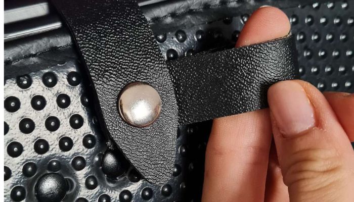 Pod komorą zaciskową umieszczono dodatkową dolną tacę zamykaną na klips, dedykowaną drobnym narzędziom. Dostaniesz się do niej dzięki wygodnemu skórzanemu uchwytowi, a dołączone do walizki podziałki umożliwią indywidualne dostosowanie tej przestrzeni do własnych potrzeb.