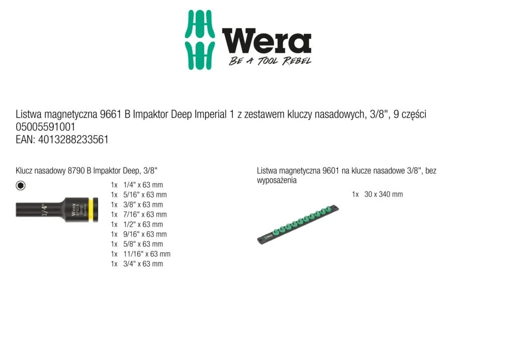 Listwa magnetyczna 9661 B Impaktor Deep Imperial 1 z zestawem kluczy nasadowych; 3/8"; 9 części Wera