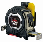 Wysokiej klasy profesjonalna miara zwijana 7,0 m z magnetyczną podstawą i uchwytem do mocowania przy pasku firmy Tajima. Dwustronna biała taśma stalowa pokryta bardzo odporną na ścieranie powłoką, z czarną podziałką w cm i mm, czerwone liczby dziesiętne. Pokryta odporną na zarysowania i antyrefleksyjną powłoką poliestrową. Miara zwijana 7,0 m z przesuwanym magnetycznym zaczepem początkowy (odczyt zew. i wew.) mocowany z taśmą w czterech punktach. Z przyciskiem do zatrzymywania i blokowania cofającej się taśmy. Posiada wkładkę (zderzak) łagodzącą uderzenie zaczepu taśmy o obudowę. Oznaczenia: metrologiczne, znak CE. Obudowa taśmy odporna na uderzenia, wykonana z bardzo mocnego tworzywa sztucznego ABS. Szybkozłączny uchwyt na pasek umożliwia zamocowanie i szybkie odpięcie miary przy użyciu jednej ręki. Zabezpiecza przed upuszczeniem lub niewłaściwym ułożeniem. Miara zwijana 7,0 m z bardzo silnym podwójnym magnesem, co umożliwia jednoręczną i samodzielną pracę. Miara zwijana W-MAG Safety Belt Holder przydatna podczas różnego rodzaju zastosowań warsztatowych, montażowych np. konstrukcji stalowych oraz użytku domowego.