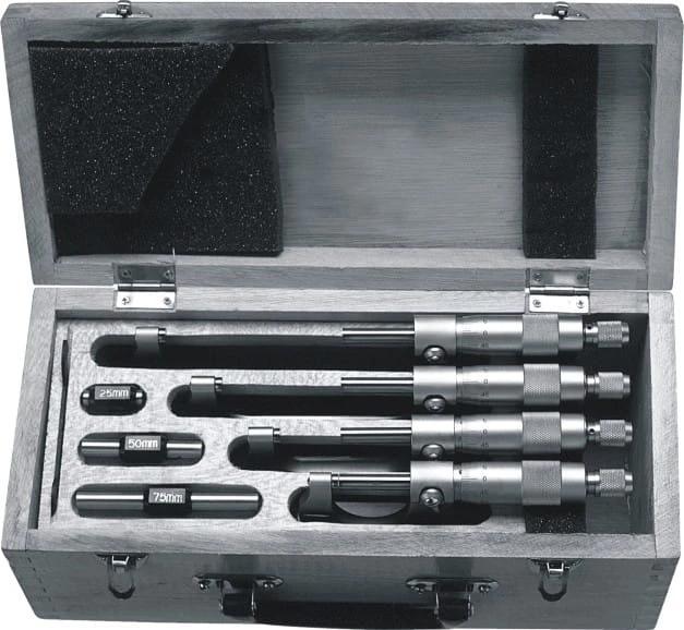 Każdy mikrometr w zestawie charakteryzuje się dokładnością odczytu 0,01 mm, skokiem wrzeciona 1/2 mm oraz hartowanym i szlifowanym wrzecionem, co gwarantuje stabilność pomiaru i długą żywotność nawet przy intensywnym użytkowaniu, a zastosowana grzechotka zapewnia stałą siłę docisku, eliminując błędy wynikające z nadmiernego nacisku operatora.