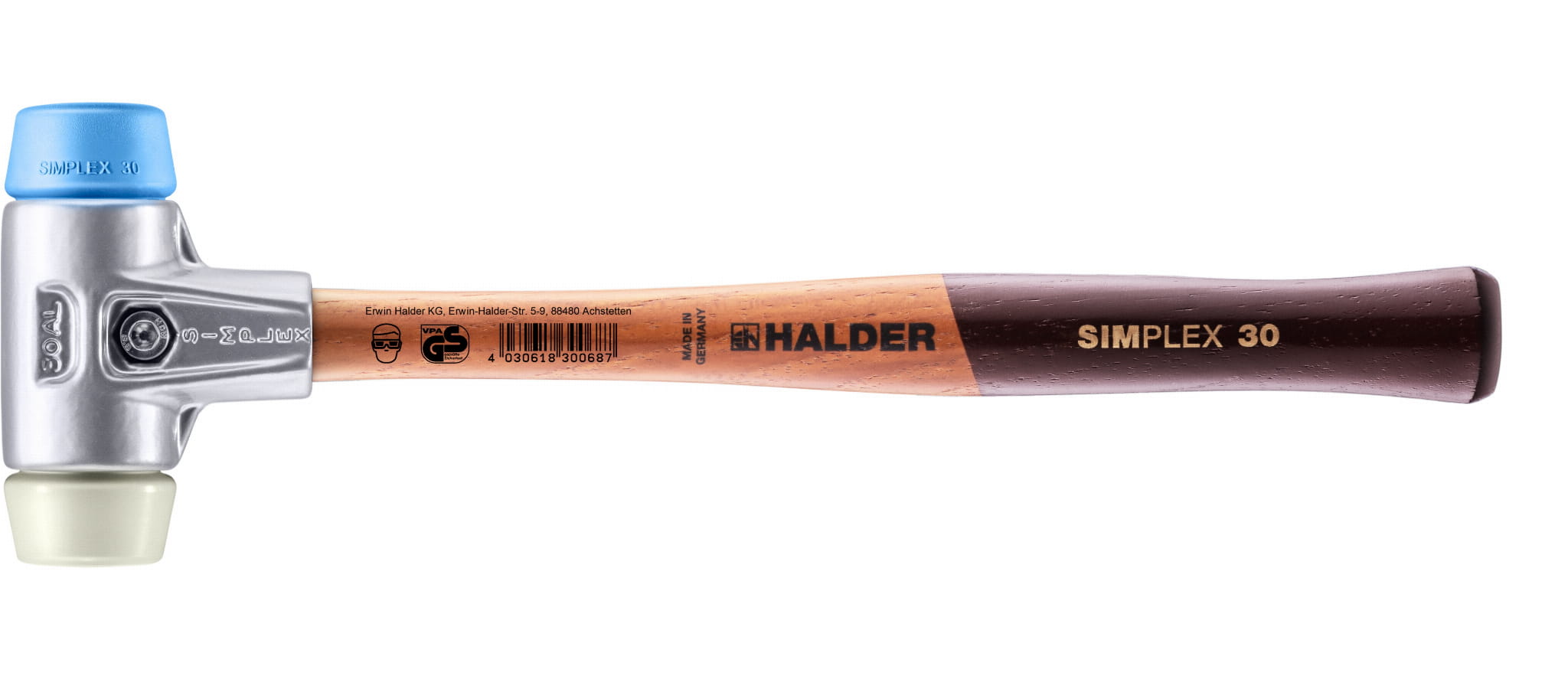 Młotek SIMPLEX z końcówkami z niebieskiego miękkiego elastomeru i białego nylonu Halder 3118