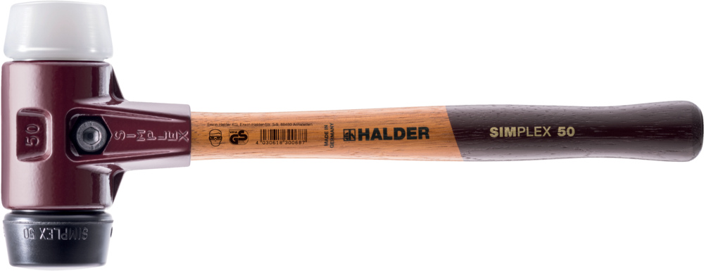 - końcówki młotka Halder to połączenie kauczuku kompozytowego (czarny, średnio twardy, amortyzujący uderzenia, bezwonny, o niskim zużyciu) i super plastik (biały, średnio twardy, bardzo wytrzymały) - profesjonalna, łatwa i przyjemna praca