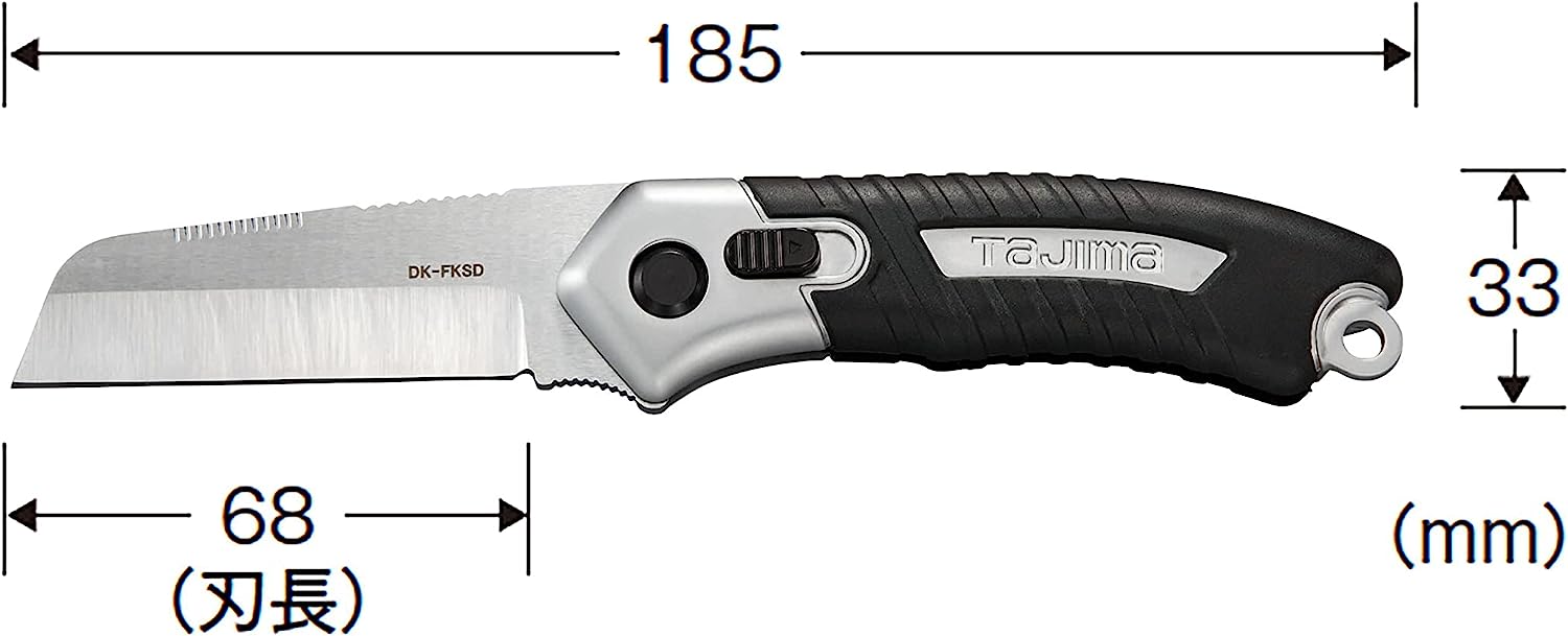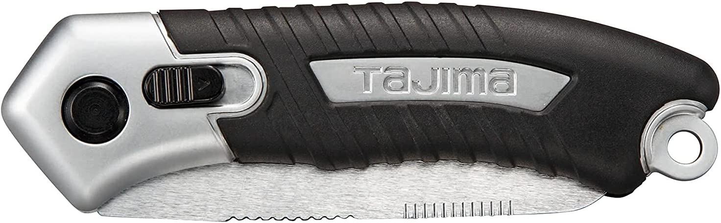 Profesjonalny, kompaktowy nóż składany firmy Tajima. Japoński wzór ostrza o wydrążonych krawędziach z bardzo ostrym utwardzonym ostrzem idealnie nadaje się do cięć pionowych. Na górze noża znajdują się nacięcia, które można wykorzystać np: do usuwania zadziorów. Przesuwany mechanizm blokady bezpieczeństwa zapewnia, że ostrze blokady pozostaje schowane i nie zamyka się podczas używania. To niezwykle ostre ostrze doskonale poradzi sobie przy trudnych i precyzyjnych cięciach jak i uniwersalnym zastosowaniu. Wygodna, lekko zakrzywiona rękojeść noża składanego wykonana z antypoślizgowego elastomeru, nie ślizga się nawet w rękawiczkach. Na końcu rękojeści oczko do zamocowania linki zabezpieczającej lub kółka.