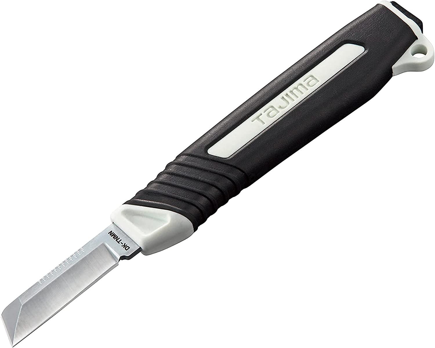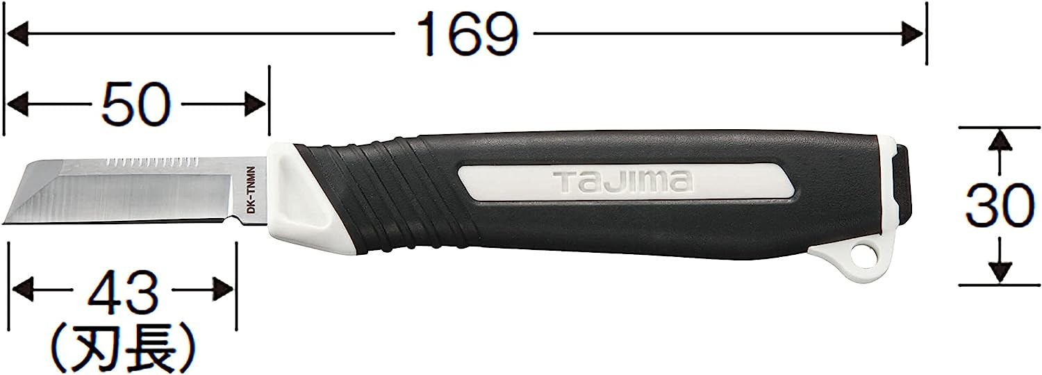 Uniwersalny nóż Tajima do obróbki kabli i przewodów np. zdejmowania izolacji. Ostrze z krótkim, hartowanym ostrzem z funkcją dłuta, wykonane z jednego kawałka stali nierdzewnej. Piaskowany kilka razy. Noża można również użyć do gratowania obrobionego materiału, do cięcia, zdzierania, szorstkowania, skrobania i dłutowania. Nóż monterski do kabli może być używany z młotkiem jako podbijak z funkcją podobną. Długa ergonomiczna, antypoślizgowa rękojeść z tworzywa z oczkiem, zakończona wymienną wkładką do pobijania. Nóż monterski do kabli dostarczany jest z osłoną ostrza z tworzywa. Nóż doskonale sprawdzi się podczas prac przy montażu instalacji elektrycznych, a także innych zastosowań. Klips do paska dostępny jako wyposażenie dodatkowe.