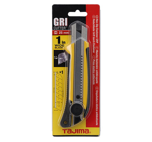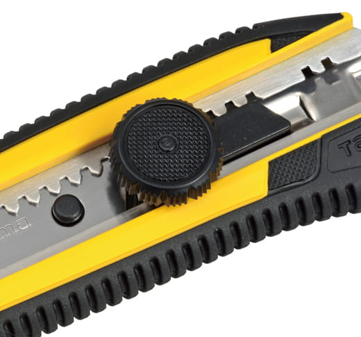 Wysokiej klasy profesjonalny nóż z łamanym ostrzem 25 mm z z pokrętłem blokującym firmy Tajima. Mocna stalowa prowadnica ostrza. Ergonomiczna, rękojeść z elastomeru z prążkowanym antypoślizgowym wygodnym i pewnym chwytem. Nóż z bardzo ostrym ostrzem, trwałość i ostrość ostrza jest niezwykła ze względu na jakość stali, z której są wykonane, a technologie hartowania i ostrzenia są najnowsze. Stal ta produkowana jest w Japonii, a tradycja produkcji ostrzy łamanych w Tajimie sięga 100 lat. Nóż z łamanym ostrzem doskonale sprawdzi się do cięcia papieru, folii i innych cienkich materiałów w pracach budowlanych, dekoratorskich, remontowych, modelarskich, warsztatowych itp.