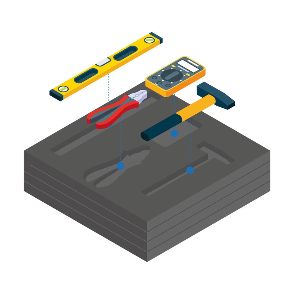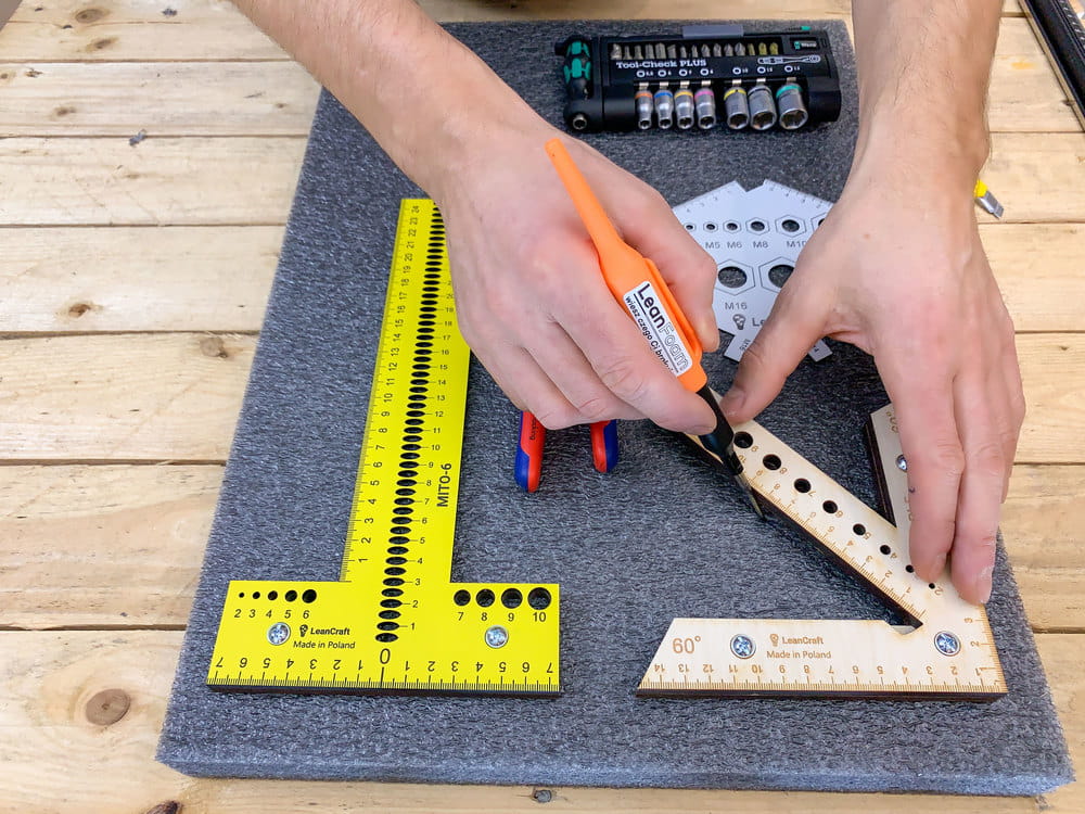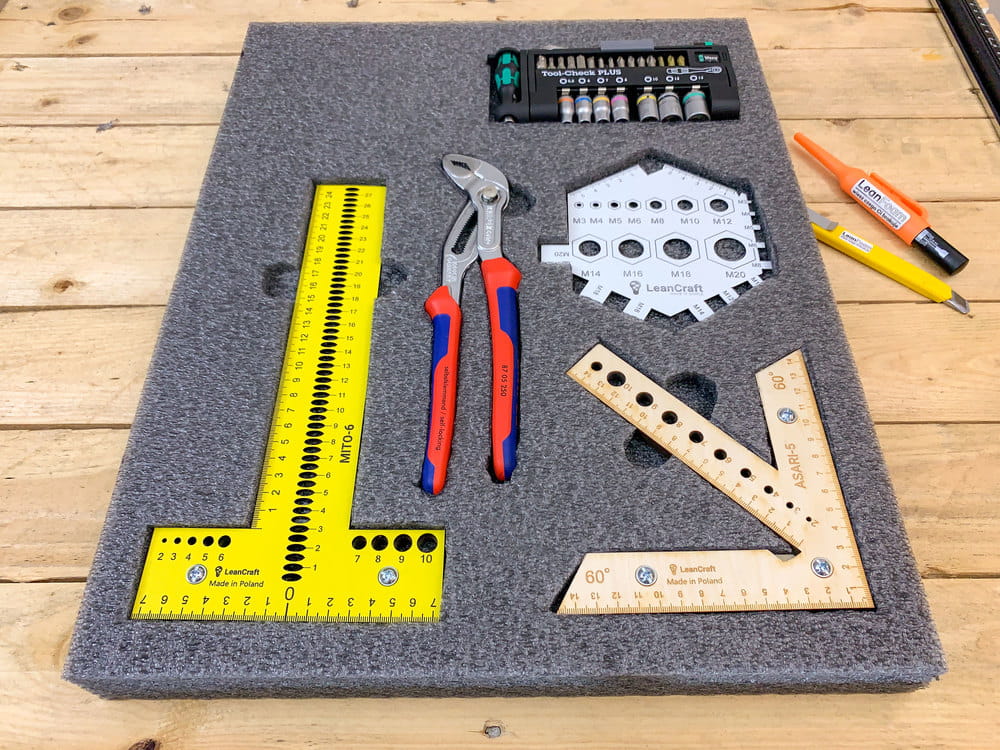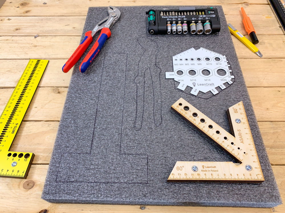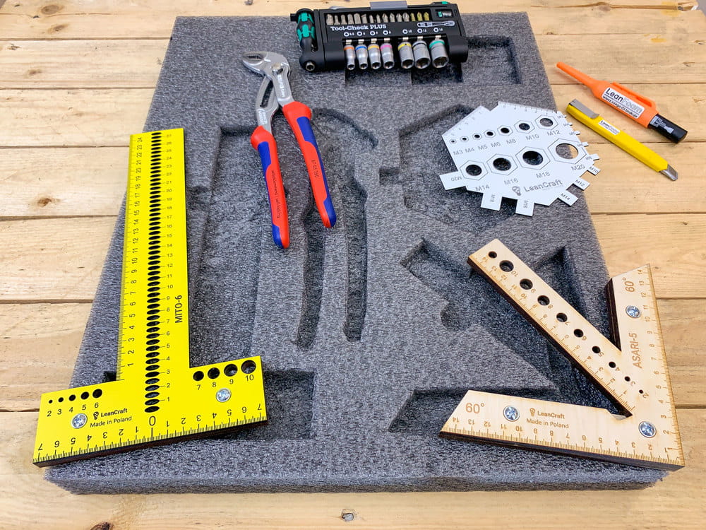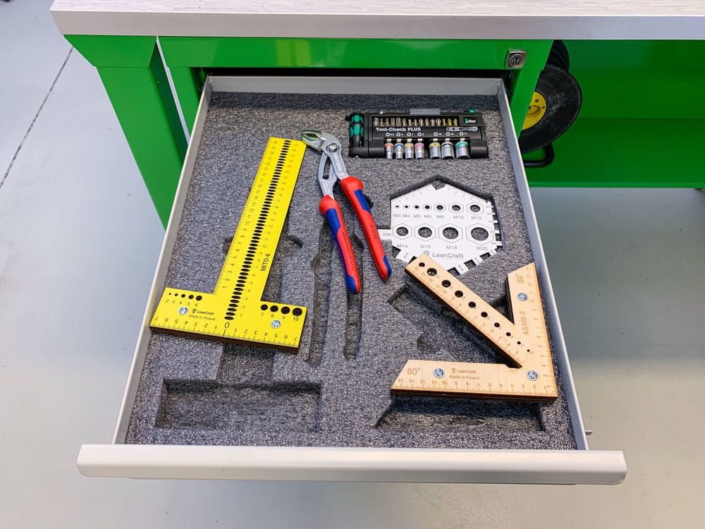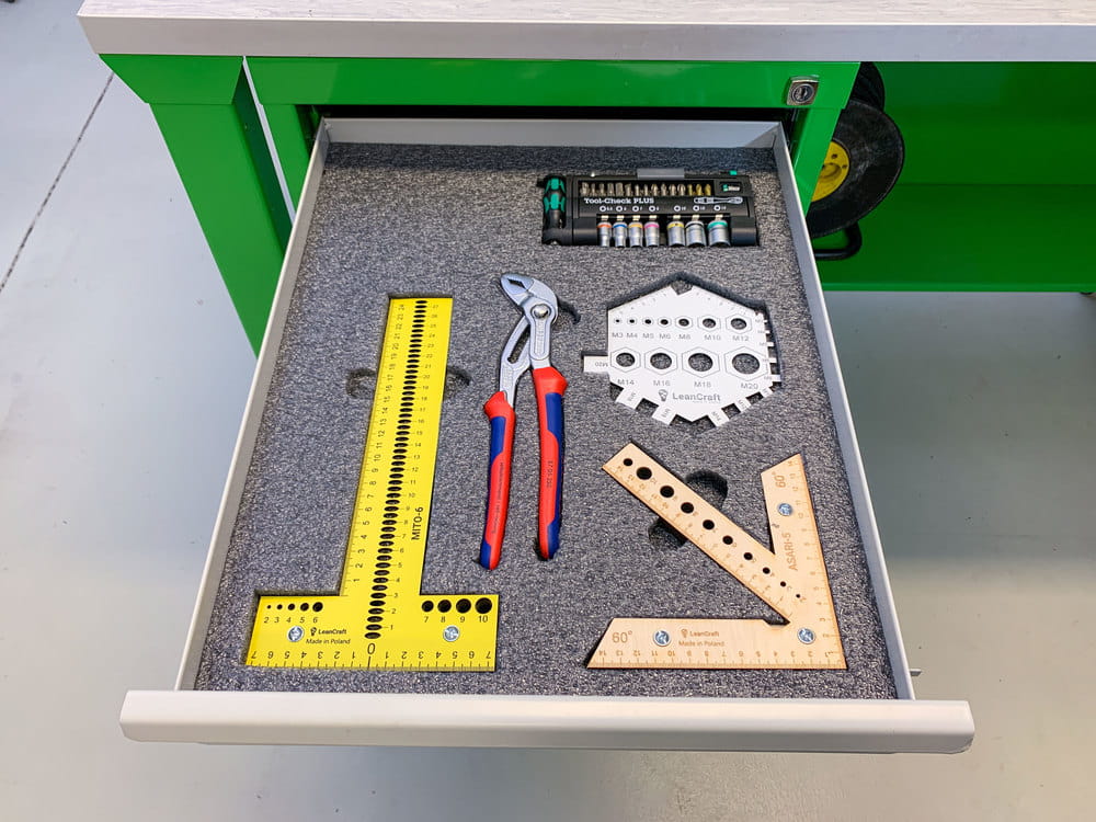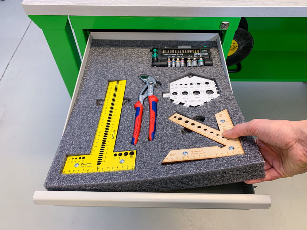 Szuflada to miejsce do przechowywania, które teoretycznie ma zaprowadzić porządek w naszym miejscu pracy. Jednak wszyscy wiemy, że niejednokrotnie to właśnie w niej panuje największy nieład. Narzędzia znajdujące się w takiej szufladzie trudno odnaleźć, a do tego powstają na nich otarcia i uszkodzenia. Pianki do szuflad narzędziowych to doskonałe rozwiązanie dla panującego w szufladzie bałaganu. Sprawdzą się do szaf narzędziowych w warsztatach, na liniach produkcyjnych, czy nawet w szufladach w biurze. Dedykowane pod konkretne narzędzie, puste miejsce zasygnalizuje, że jakiś przedmiot nie został odłożony. Oprócz uporządkowanego miejsca pracy zyskujemy również na czasie w odnajdywaniu i odkładaniu narzędzi i innych przedmiotów na swoje miejsce.