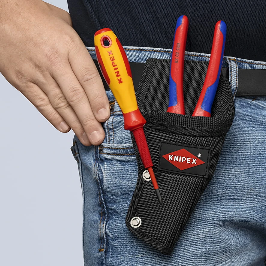 Uniwersalna kieszeń do mocowania na pasku, stożkowa na 1 do 3 narzędzia ręczne. Idealnie ukształtowana pod kątem nożyczek dla elektryków 95 05 20 SB. Nadaje się również do noży uniwersalnych KNIPEX CutiX® lub podobnych smukłych narzędzi, takich jak szczypce, szczypce chwytające TwinGrip przednie itp. Z uchwytem na długopis. Wykonana z wytrzymałej tkaniny poliestrowej.