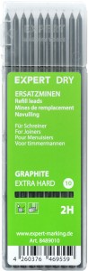 Wymienne wkłady (rysiki) do ołówka automatycznego 2,8 mm, Expert. Zestaw zawiera 10 wkładów grafitowych 2H ekstra twardych. Przeznaczone są do znakowania większości powierzchni - suchych, wilgotnych, szorstkich, pokrytych pyłem, a nawet tłustych. Umożliwia pisanie na wielu materiałach takich jak: metal, plastik, ceramika, drewno, kamień, guma. Ołówek automatyczny z wkładami doskonale sprawdza się do prac budowlanych, stolarskich, warsztatowych. Wykonane oznaczenia za pomocą rysika z łatwością zmyjemy na mokro. Wygodne opakowanie zabezpieczające rysiki 2H ekstra twarde przed złamaniem.