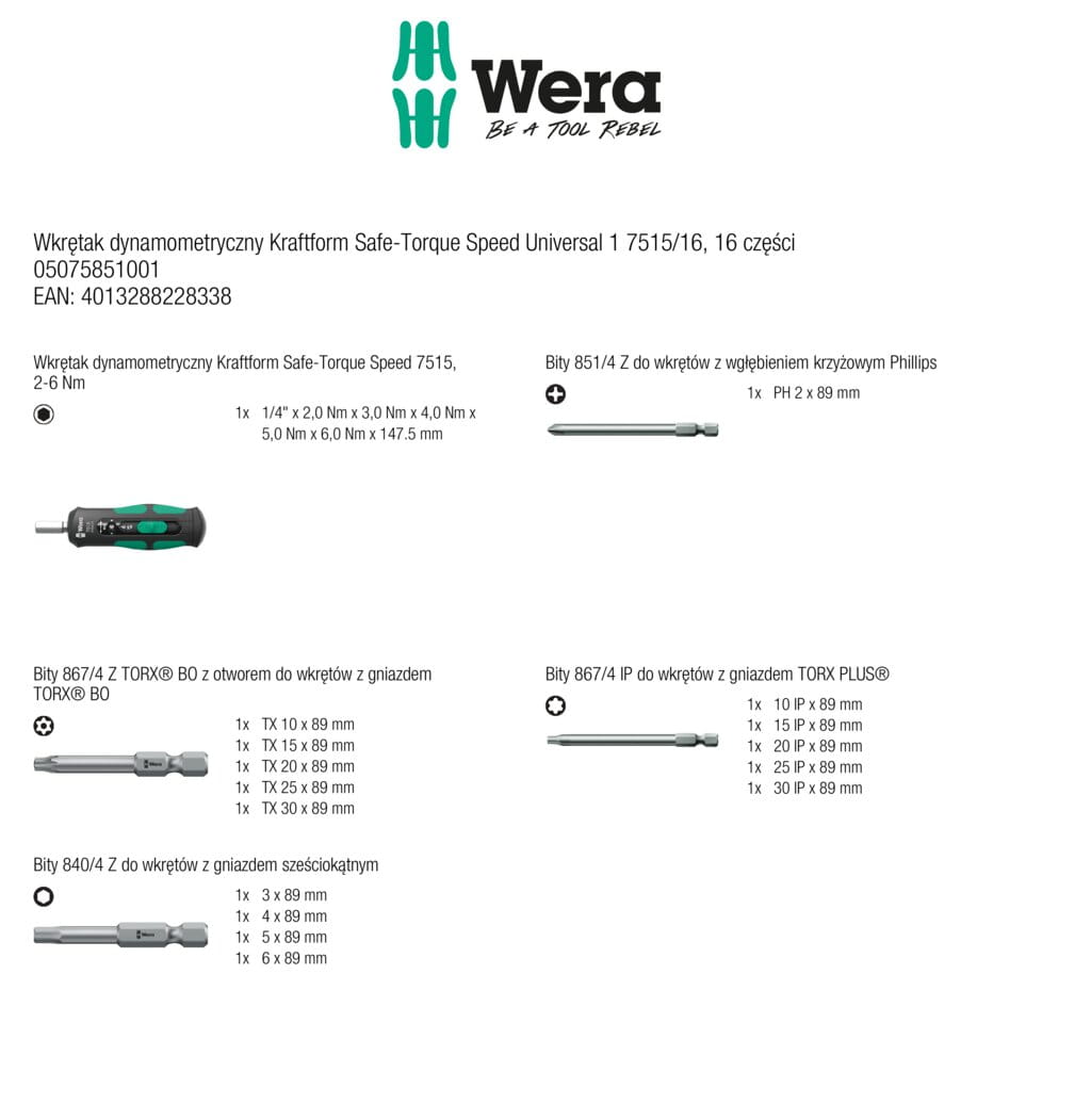 - uniwersalność i mobilność – dzięki gniazdu na bity 1/4" oraz kompatybilności z adapterami do nasadek, narzędzie staje się wszechstronnym pomocnikiem, który dodatkowo bez problemu połączysz z systemem transportowym Wera 2go