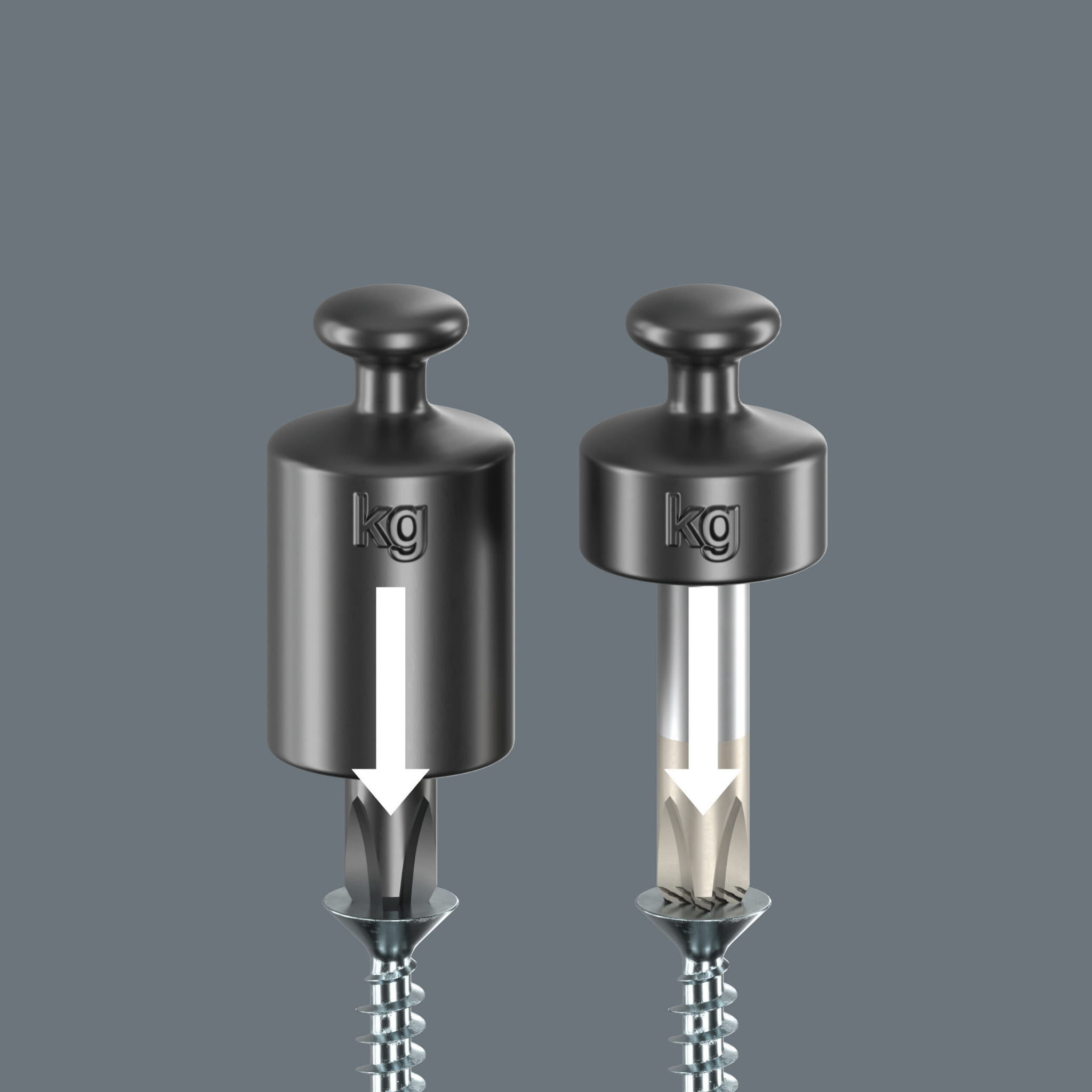 - ochrona przed ześlizgiwaniem – dzięki mikrochropowatości końcówki Lasertip, wymagana siła docisku jest znacznie mniejsza, co drastycznie redukuje ryzyko wypadnięcia wkrętaka z nacięcia śruby i uszkodzenia delikatnych powierzchni wokół niej