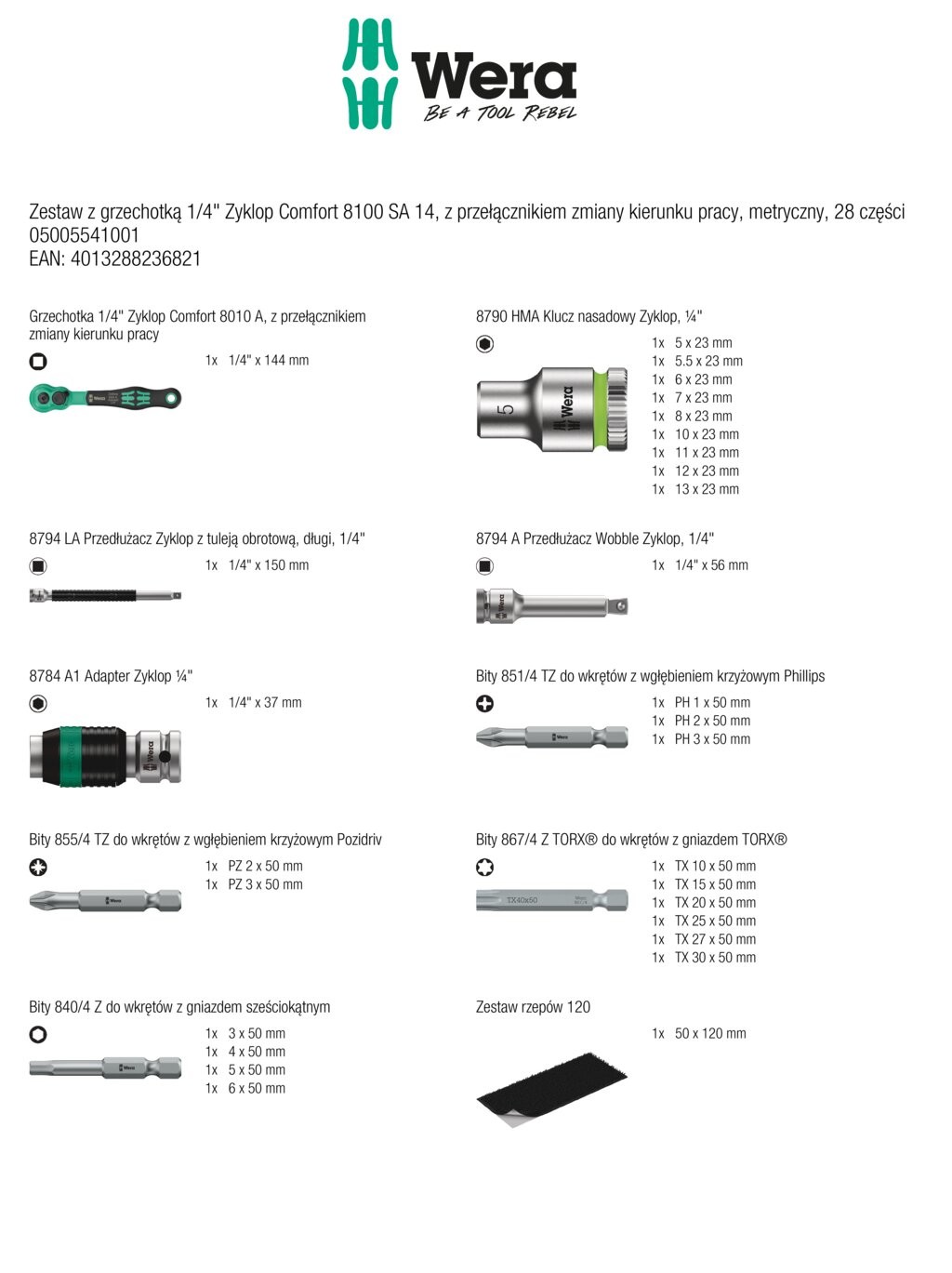 Zestaw kluczy nasadowych z grzechotką 1/4" Zyklop Comfort 8100 SA 14, z przełącznikiem zmiany kierunku pracy, metryczny, 28 części Wera