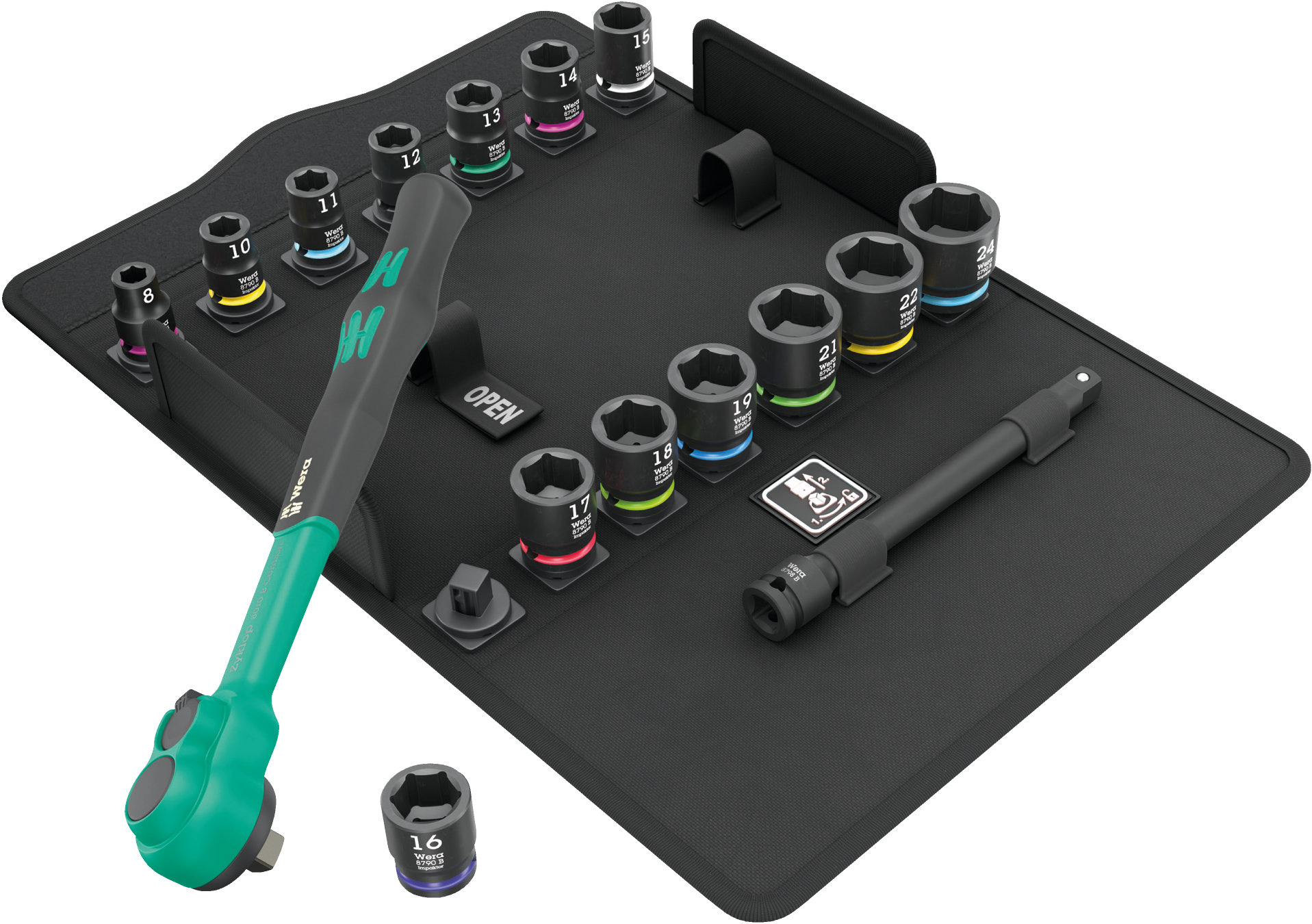 Wysokiej jakości profesjonalny 16-częściowy zestaw metryczny kluczy nasadowych z grzechotką firmy Wera. Zestaw składa się z grzechotki z 3/8" Zyklop Comfort z przełącznikiem zmiany kierunku pracy, 14 kluczy nasadowych Zyklop Impaktor, 1 przedłużka Zyklop. Grzechotka z komfortową osłoną z tworzywa sztucznego zapewnia wygodę podczas użytkowania. Dzięki smukłej konstrukcji, narzędzie doskonale sprawdza się w bardzo wąskich przestrzeniach montażowych, zapewniając swobodę ruchu i precyzję pracy. Grzechotka drobnozębna z 80 zębami oraz niewielkim kątem powrotu zapadki wynoszącym zaledwie 4,5°, umożliwia efektywne i płynne wykonywanie zadań. Przełącznik zmiany kierunku pracy oraz funkcja niezawodnego blokowania kluczy nasadowych za pomocą przycisku dodatkowo zwiększają wygodę i bezpieczeństwo użytkowania narzędzia. Osłona dwukomponentowa wykonana z tworzywa sztucznego zapewniająca komfortowe użytkowanie grzechotki Zyklop Comfort nawet w niskich temperaturach. Dodatkowo osłona chroni powierzchnie przed uszkodzeniem, co zwiększa trwałość narzędzia i zapewnia jego długotrwałe użytkowanie. Przeznaczona do kluczy nasadowych czworokątnych 3/8" oraz adapterów z zabierakiem czworokątnym 3/8" i zatrzaskiem kulkowym. Technologia Zyklop Impaktor pozwala na uzyskanie ponadprzeciętnej żywotności kluczy nasadowych nawet w najbardziej wymagających warunkach pracy. Dzięki systemowi wyszukiwania narzędzi "Take it easy" (kodowanie kolorami według rozmiaru), można szybko odnaleźć potrzebny rozmiar, co zwiększa wydajność i oszczędza czas. Ponadto przedłużka Zyklop może być używana do pracy z trudno dostępnymi nakrętkami i śrubami, zapewniając wszechstronność i elastyczność w różnych zastosowaniach. Zestaw metryczny kluczy nasadowych z grzechotką 3/8" Zyklop Comfort w bardzo wytrzymałym i trwałym tekstylnym etui z dodatkową strefą z włókniny na odwrocie. Dzięki dołączonemu samoprzylepnemu paskowi z rzepem, etui może być łatwo przyklejane do różnych elementów systemu do transportu narzędzi Wera 2go, ścianek, półek czy wózków warsztatowych. Ta praktyczna funkcja zapewnia wygodę w organizacji narzędzi oraz łatwy dostęp do nich podczas pracy. Zestaw przydatny do wszelkiego rodzaju prac montażowych i serwisowych w warsztatach oraz w przemyśle. Idealnie nadaje się dla profesjonalistów oraz hobbystów, którzy cenią sobie wysoką jakość, wytrzymałość, oraz wszechstronność w codziennej pracy.