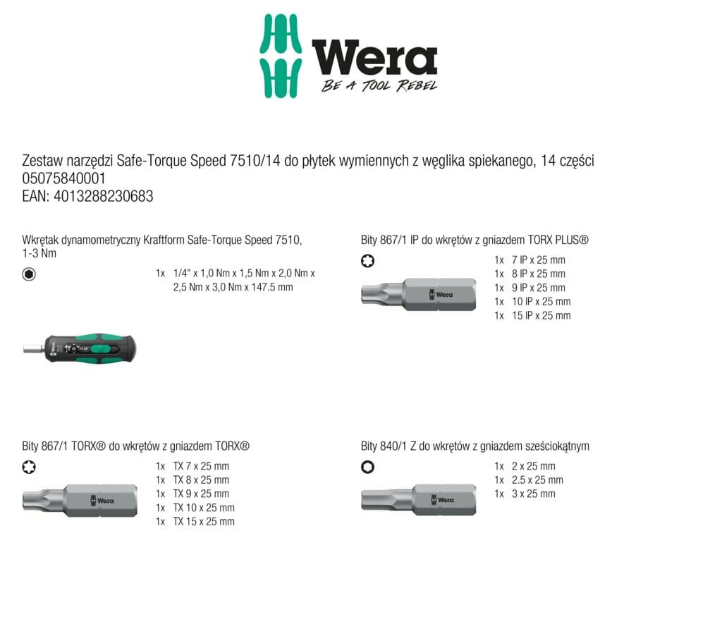 Zestaw narzędzi Safe-Torque Speed 7510/14 do płytek wymiennych z węglika spiekanego; 14 części Wera