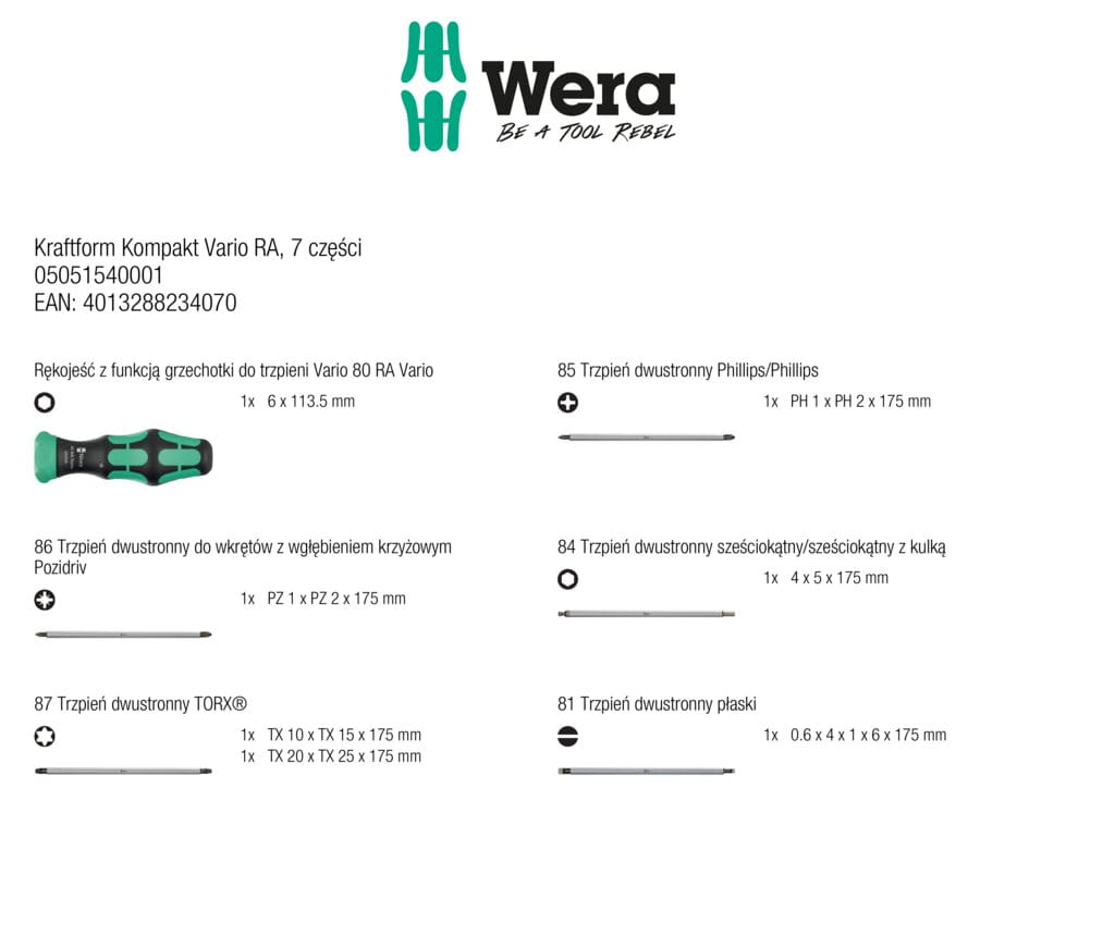 Zestaw narzędzi wkrętakowych Kraftform Kompakt Vario RA; 7 części Wera