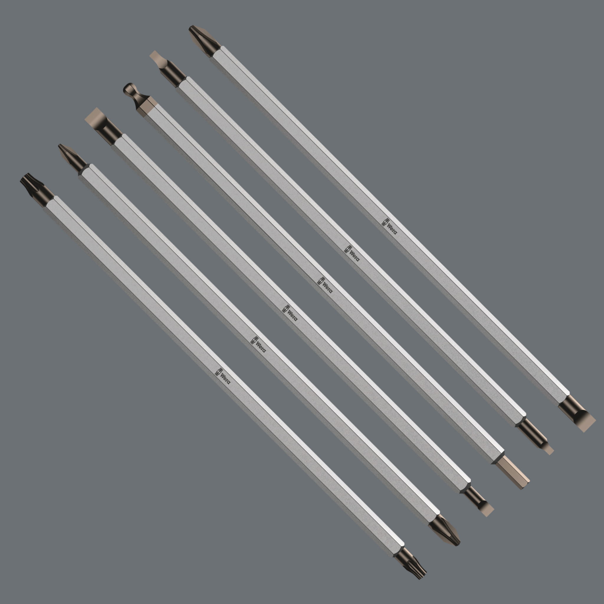 W zestawie narzędzi wkrętakwych znajdziesz 6 dwustronnych trzpieni o długości 175 mm. Każdy z nich oferuje dwa różne profile, co daje Ci łącznie 12 kombinacji końcówek. To genialna oszczędność miejsca – jeden zestaw trzpieni zastępuje całą serię tradycyjnych wkrętaków, zachowując przy tym pełną wytrzymałość sześciobocznego profilu 6 mm.