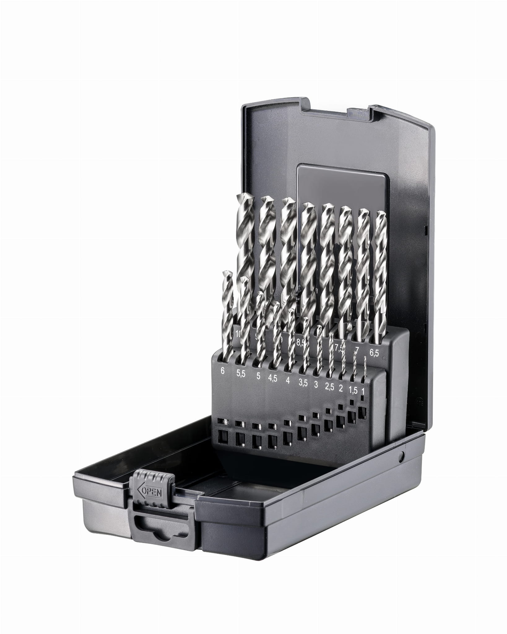 Wysokiej jakości 19 - częściowy zestaw wierteł spiralnych do metalu firmy DKM. Szlifowane standardowe wiertła spiralnych HSS-G to narzędzia wykonane z wysokowydajnej stali szybkotnącej, zapewniające niezrównany stosunek wydajności. Dzięki precyzyjnemu szlifowi krzyżowemu, wiertło to jest samocentrujące, co oznacza, że wymaga jedynie minimalnej siły posuwu podczas użytkowania.Ten wszechstronny produkt nadaje się do użycia w różnych typach maszyn, w tym wiertarkach, wkrętarkach akumulatorowych i wiertarkach słupowych. Może być stosowany do obróbki różnorodnych materiałów, w tym stali, metali nieżelaznych oraz tworzyw sztucznych. Wiertło to umożliwia wiercenie punktowe bez konieczności wstępnego nawiercania, co zwiększa wygodę użytkowania i przyspiesza proces pracy. Posiada cylindryczny kształt trzpienia oraz kąt wierzchołkowy wynoszący 135°, co gwarantuje efektywne i precyzyjne wiercenie. Szlifowanie poprzeczne zgodnie z formą C zapewnia doskonałą jakość otworów. To niezawodne narzędzie, które sprawdzi się w wielu zastosowaniach, zapewniając profesjonalne i precyzyjne rezultaty. Zestaw zawiera 19 wierteł o różnych średnicach, w zakresie od 1.0-10.0 mm, z krokiem co 0.5 mm, umieszczonych w wygodnym plastikowym pudełku.