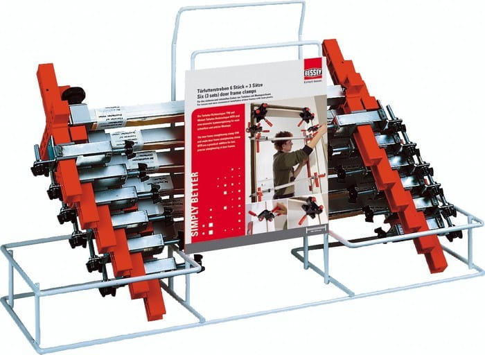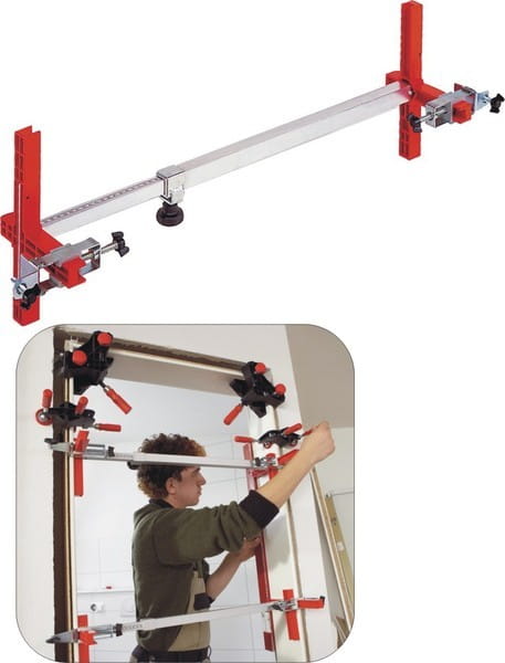 - zestaw 6 sztuk (3 kpl.) przyrządów ustalających firmy Bessey zapewniających utrzymanie stałego wymiaru wewnętrznego ościeżnicy drzwi podczas osadzania i wypełniania pianką