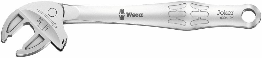 Klucz samonastawny Wera Joker 6004 M uwzględnia wszystkie wymiary metryczne i calowe w danym zakresie zastosowania 13-16 mm(1 /2"-5 /8"), dzięki automatycznie i bezstopniowo zaciskającym się szczękom równolegle prowadzonym. Klucz automatycznie dopasowuje się do wymaganego rozmiaru przy mocowaniu na nakrętce lub śrubie bez konieczności regulacji. Płaskie równoległe szczęki klucza Joker 6004 M zapobiegają zaokrągleniu łba nakrętki lub śruby pod wpływem nacisku powierzchniowego. Mechanizm zapadkowy w szczęce Jokera zapewnia szybkie i płynne dokręcanie bez potrzeby odkładania narzędzia. Pryzmy w szczękach umożliwiają uzyskanie kąta pracy, który wynosi zaledwie 30º. Jednoramienna konstrukcja w połączeniu z mechanizmem zapadkowym i pryzmami umożliwia pracę w wąskich i trudnych przestrzeniach. Klucz samonastawny Wera Joker 6004 M z mechanizmem regulacji jest wszechstronnym narzędziem do wykonywania prac z połączeniami śrubowymi. Samonastawny, gwarantuje pewny chwyt. Klucz w rączce posiada otwór, który pozwala na powieszenie na ścinie warsztatowej.