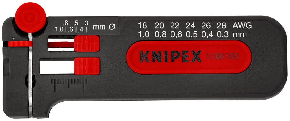 Profesjonalny przyrząd (ściągacz) firmy Knipex do usuwania izolacji z cienkich przewodów miedzianych Ø 0,3 - 1,0 mm. Precyzyjne ściąganie izolacji za pomocą stopniowej regulacji średnicy obrabianego przewodu. Nastawny ogranicznik długości usuwanej izolacji od 4,0 do 15,0 mm. Ściągacz izolacji posiada obcinak do drutu. Korpus ściągacza izolacji wykonany z tworzywa sztucznego, odporny na uderzenia. Przydatny do prac przy instalacjach telekomunikacyjnych, elektrycznych, serwisowych, montażu urządzeń elektronicznych itp.