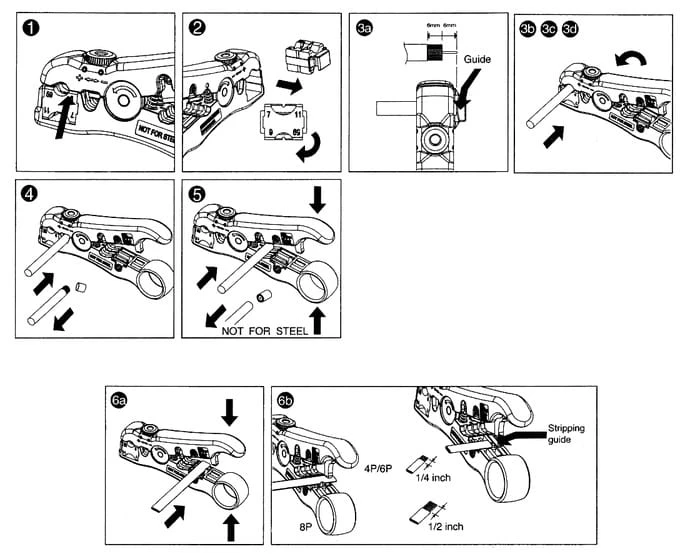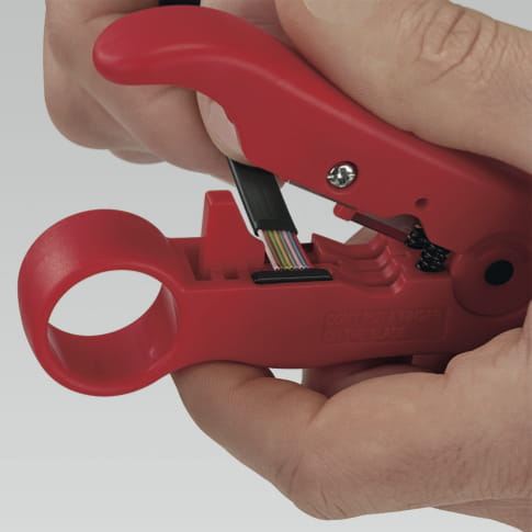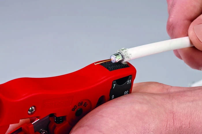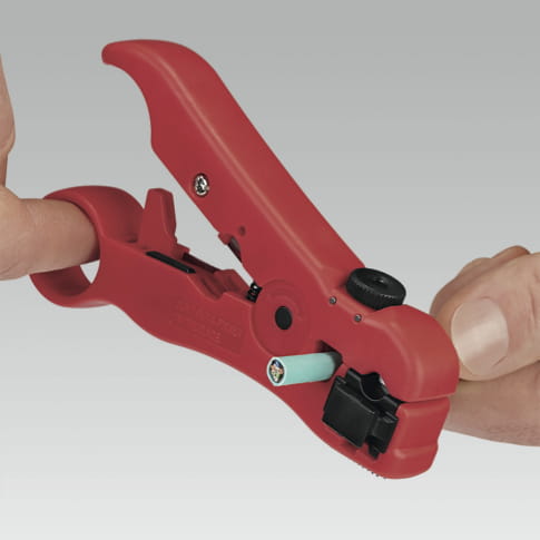 - do jednoczesnego ściągania zewnętrznej powłoki, ekranu i izolacji wewnętrznej z przewodów koncentrycznych "coax" (RG 59/6/11/7)