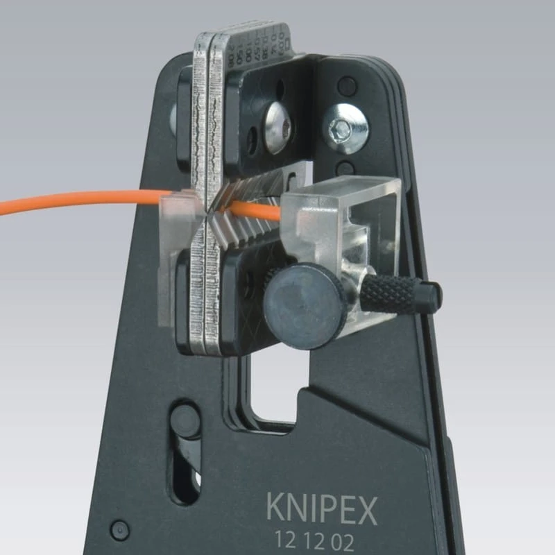 Profesjonalny automatyczny przyrząd (ściągacz) firmy Knipex do zdejmowania bez zniekształceń izolacji z przewodów jedno, wielo i cienkożyłowych z izolacją z tworzywa sztucznego, gumy, a także Teflonu®, Radoxu® itp. Z dodatkowym prowadnikiem przewodu umożliwiającym dokładne ustawienie przewodu względem ostrzy ściągających izolację. Druga para noży przytrzymuje pewnie pozostałą na przewodzie izolację. Wymienne noże kształtowe są precyzyjnie dopasowane do przekroju przewodu, nie uszkadzają żyły przewodu. Ściągacz izolacji zewnętrznej z regulowanym ogranicznikiem długości zdejmowanej izolacji zapewniającym powtarzalność wyników pracy. Noże wykonane ze specjalnej stali narzędziowej, hartowanej olejowo. Korpus ściągacza izolacji został wykonany ze stali. Przydatny do wszelkiego rodzaju prac instalacyjnych, montażowych, serwisowych oraz produkcyjnych.